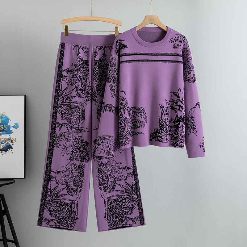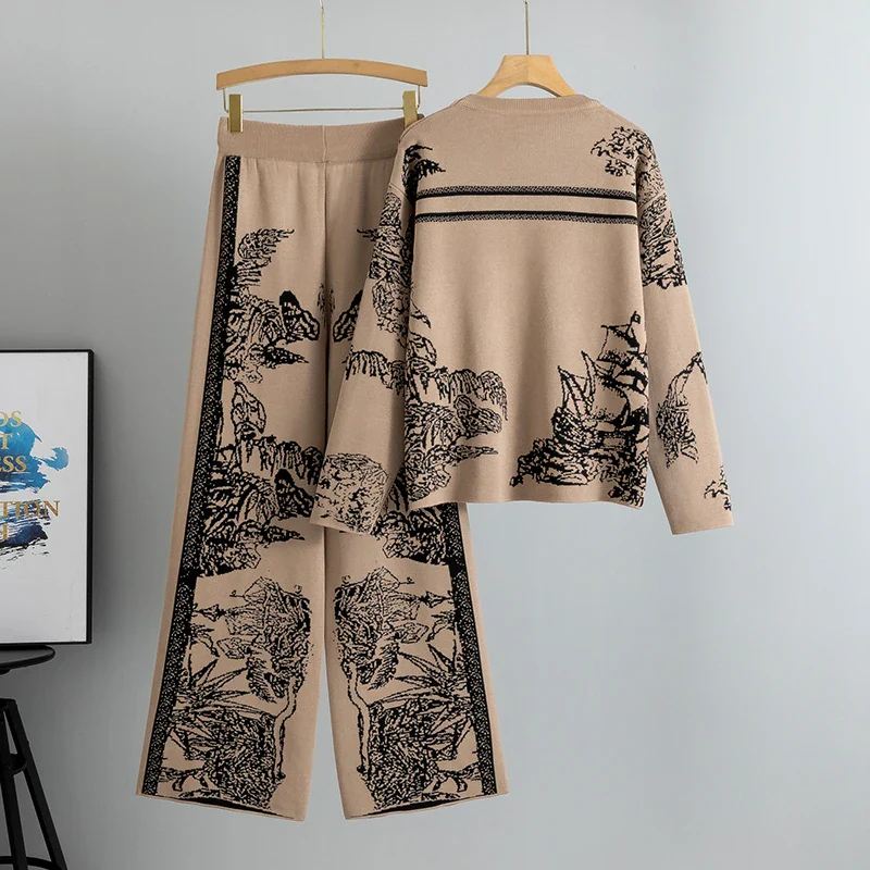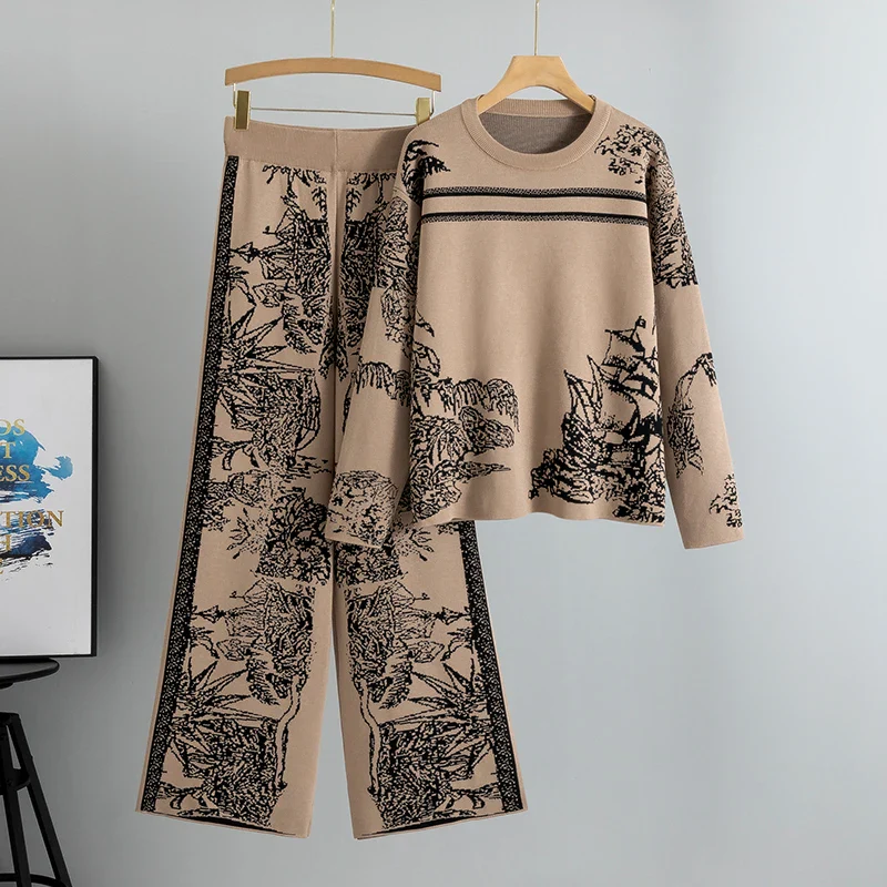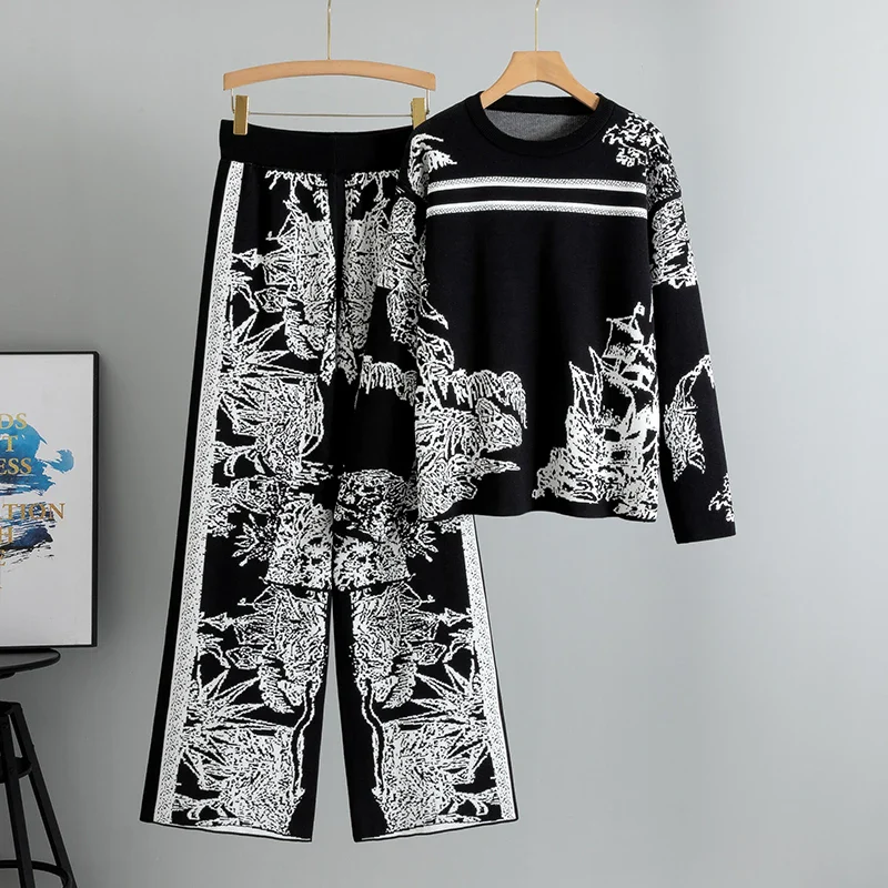Ensemble sweat-shirt et pantalon à jambes larges pour femme, décontracté, ample, élégant, tricoté