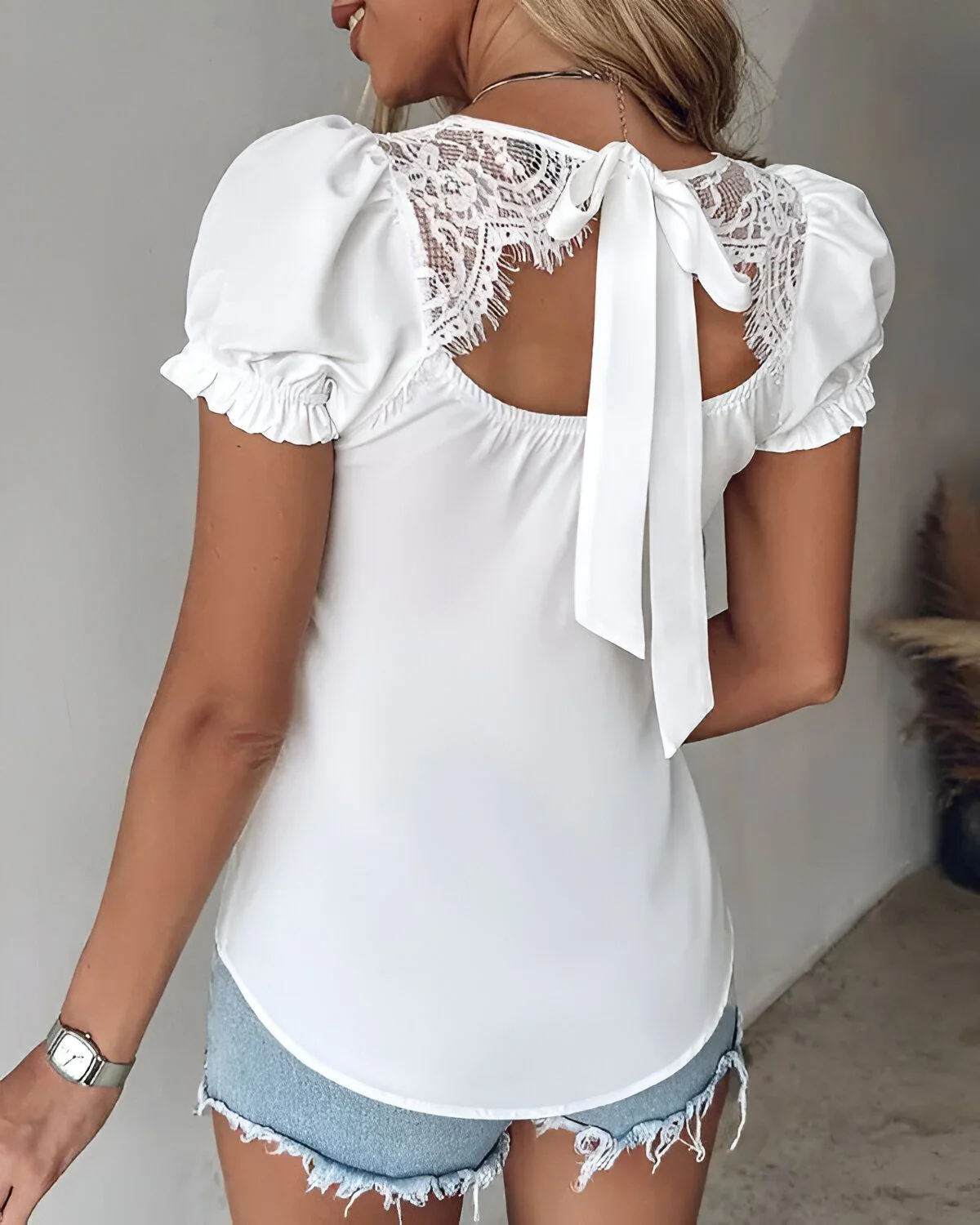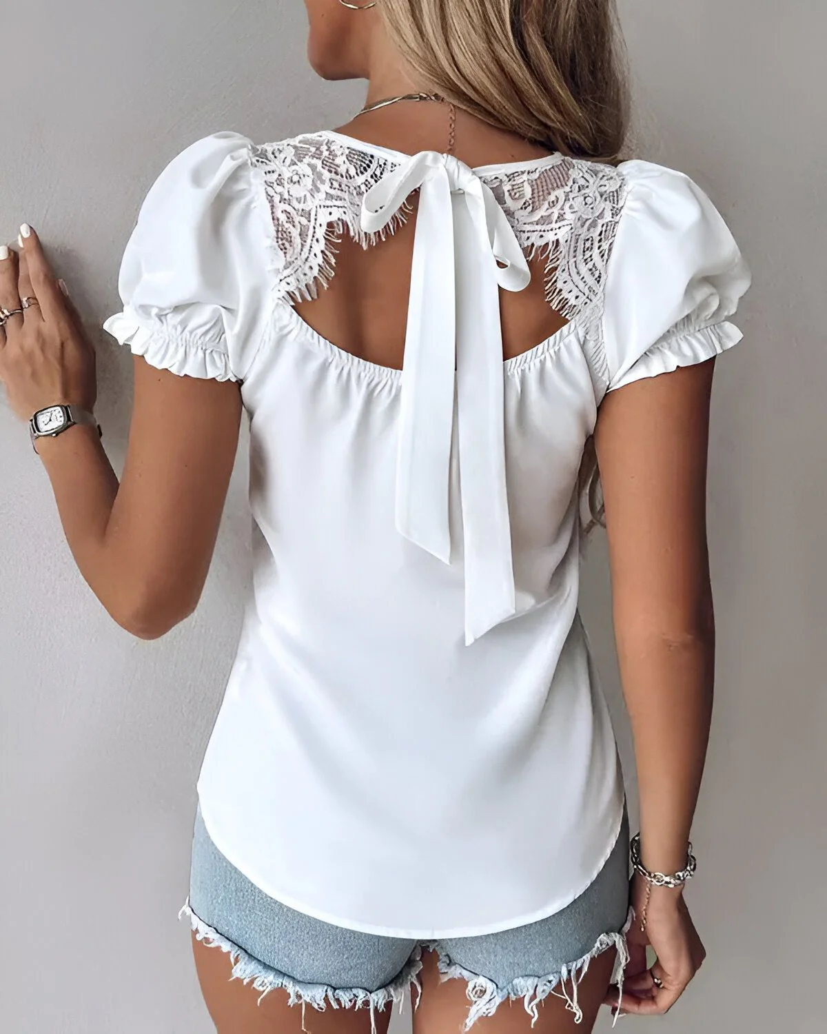 Que vous le portiez avec un pantalon habillé pour une allure professionnelle ou avec un jean pour une sortie décontractée, ce haut à patch en dentelle et manches bouffantes est un choix parfait en toute occasion.