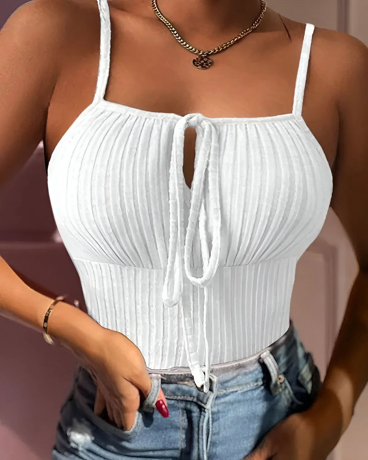 Ce somptueux haut caraco côtelé à détails noués incarne l’essence même du style chic et charmant. Sa composition en 95 % polyester et 5 % élasthanne lui confère un mélange de confort et de souplesse qui épouse délicatement les courbes du corps. Son encolure carrée apporte une touche contemporaine, tandis que ses fines bretelles dégagent une élégance intemporelle. Sa longueur classique et son motif uni en font une pièce polyvalente, idéale en toute occasion.