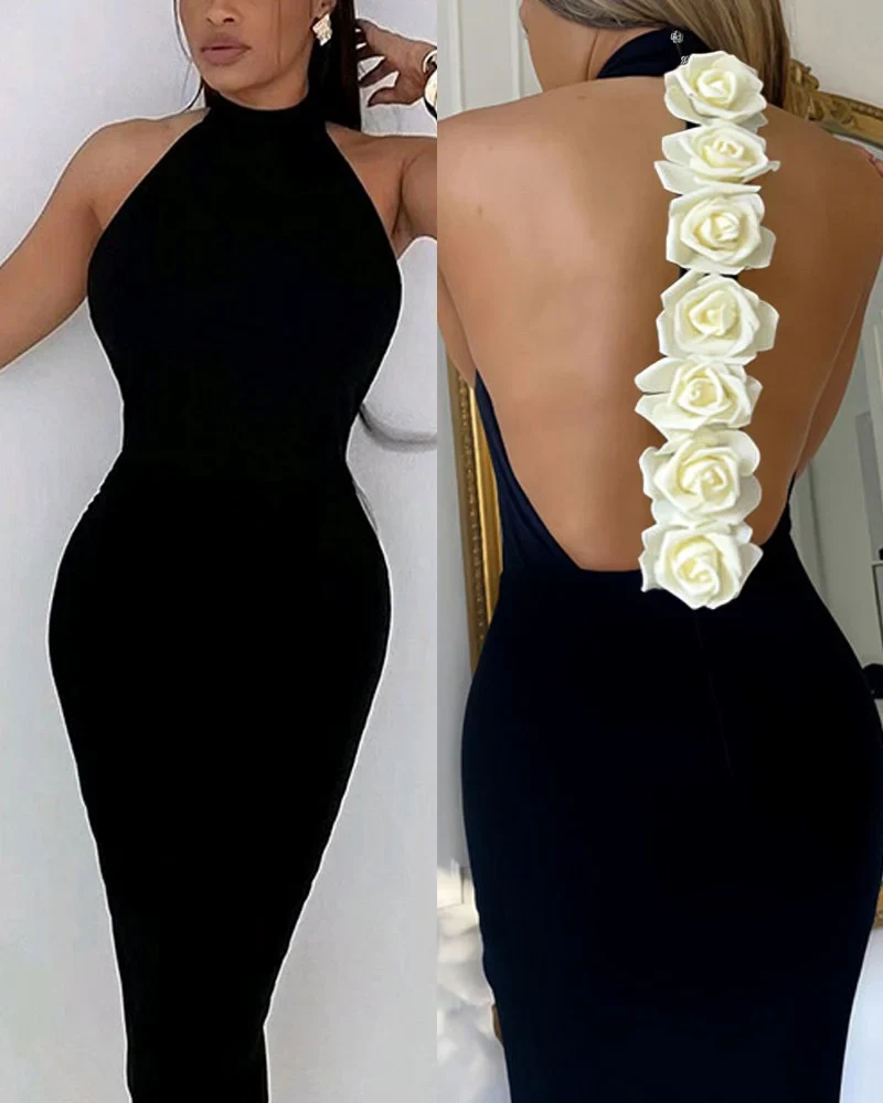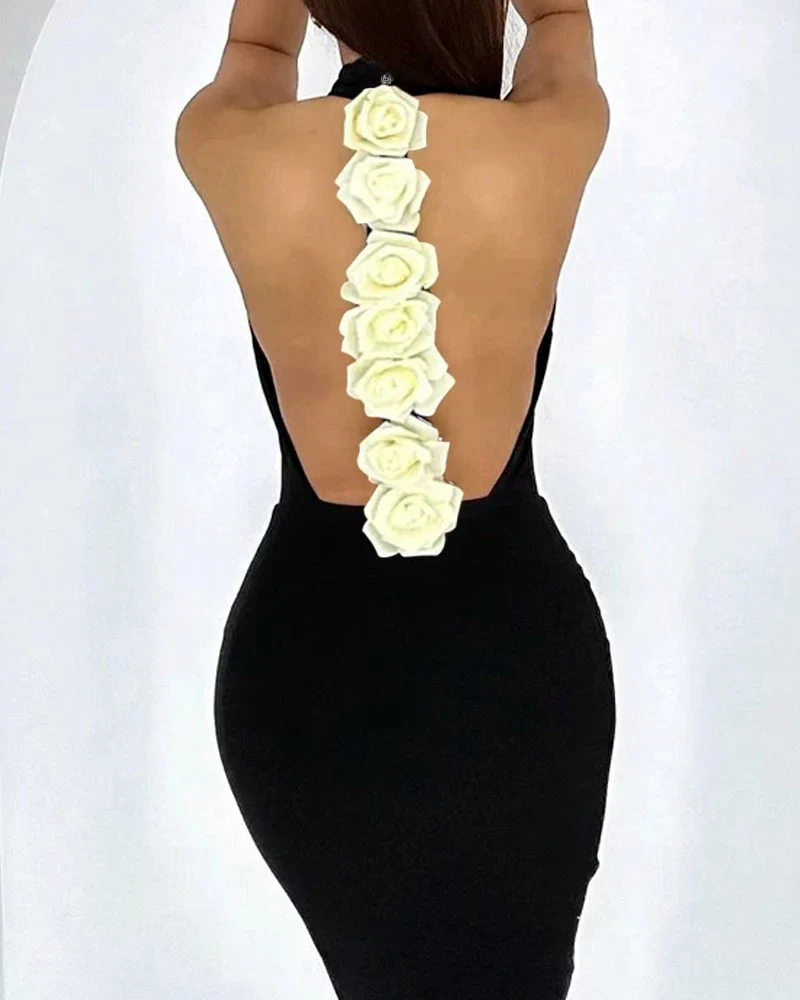 IRIS Robe élégante à détails roses pour femmes, col montant, sans manches, dos nu