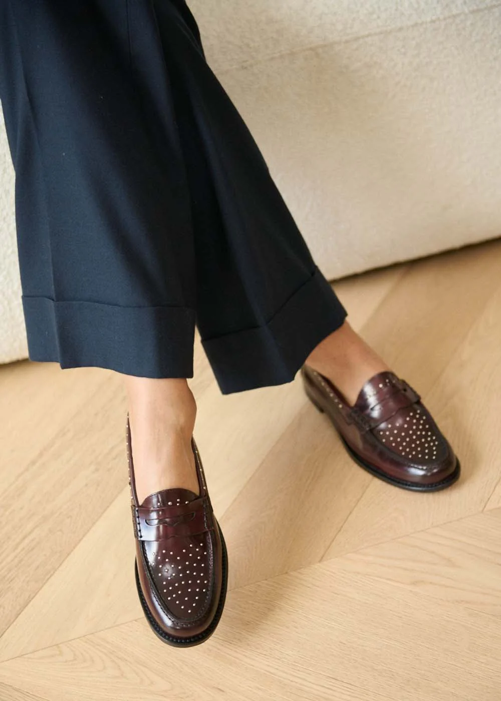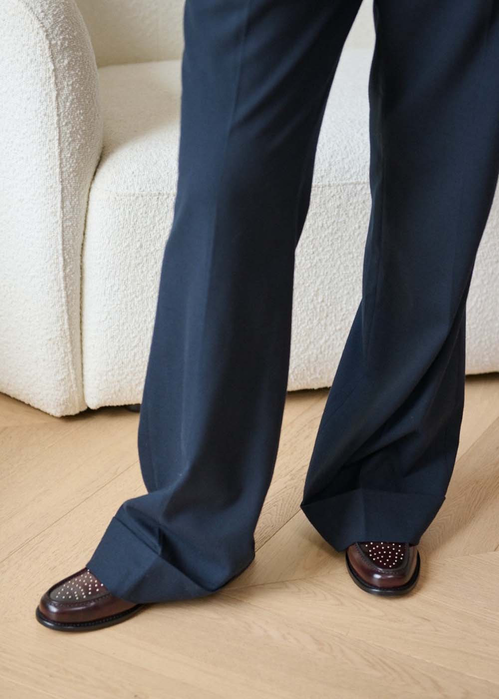 Les mocassins plats cloutés Ann Tuil Apolline revisitent un classique avec une touche de modernité. Leur silhouette épurée est rehaussée de clous métalliques subtils, apportant du caractère sans compromettre le raffinement. Parfaits pour celles qui aiment allier confort, style et une pointe d’audace dans leur quotidien.