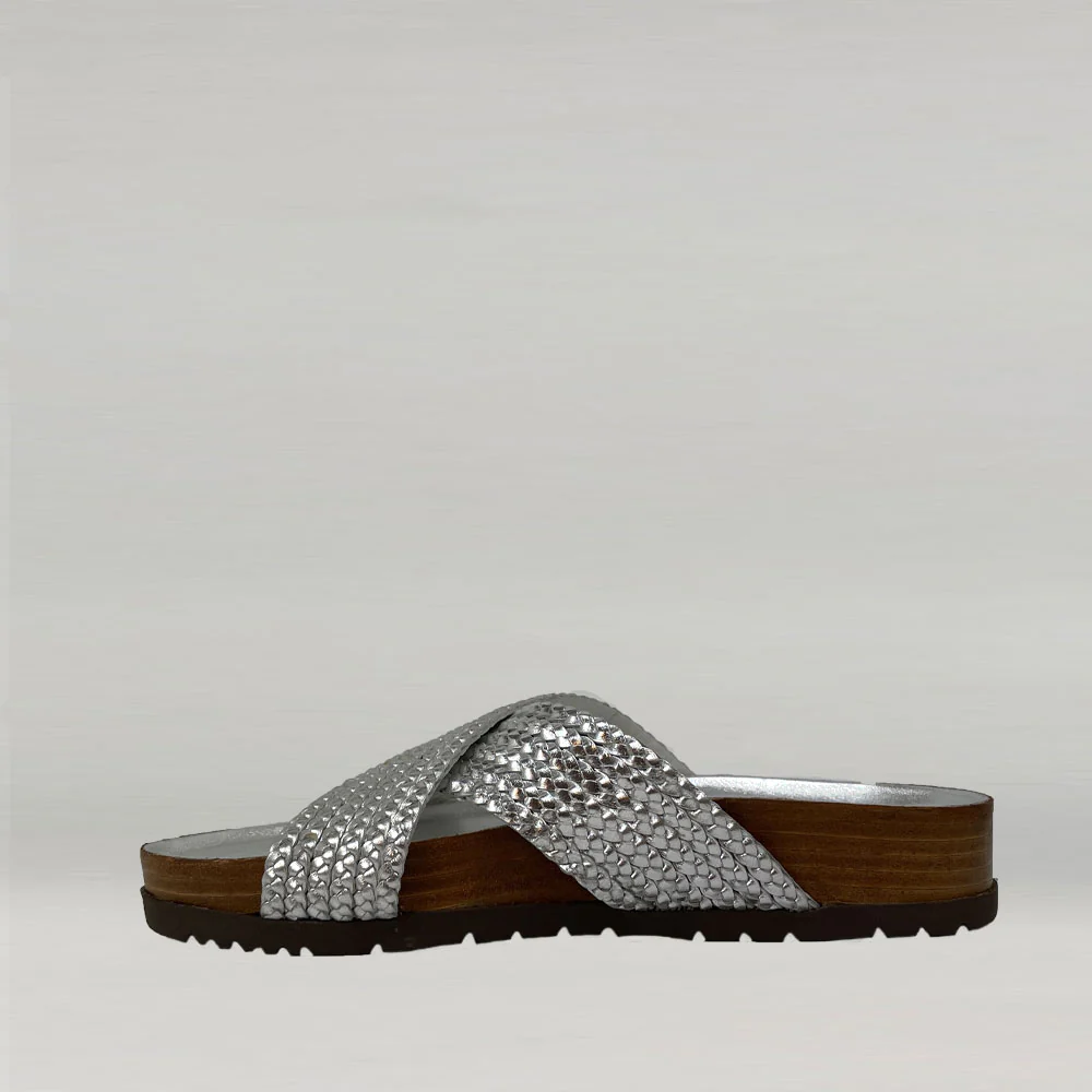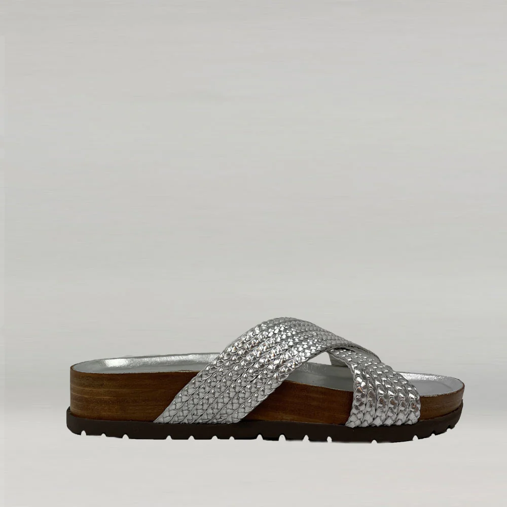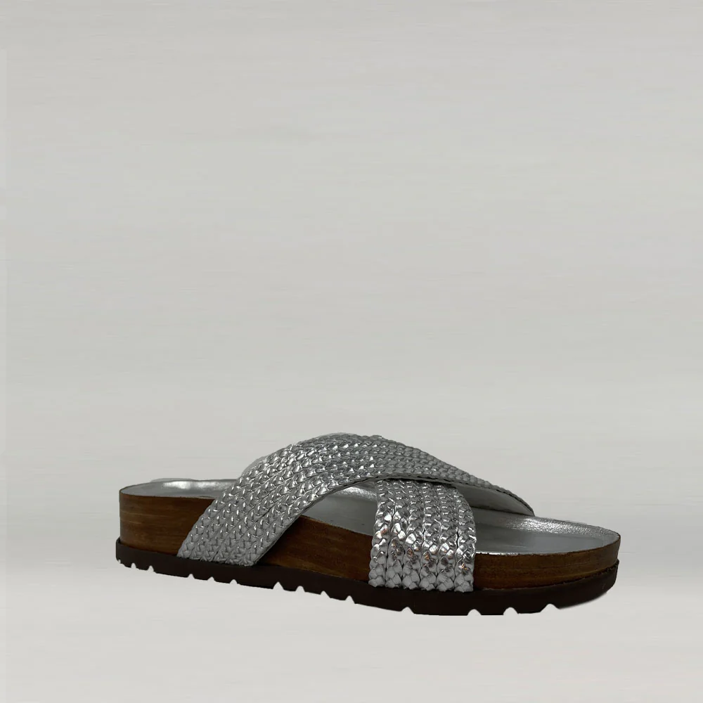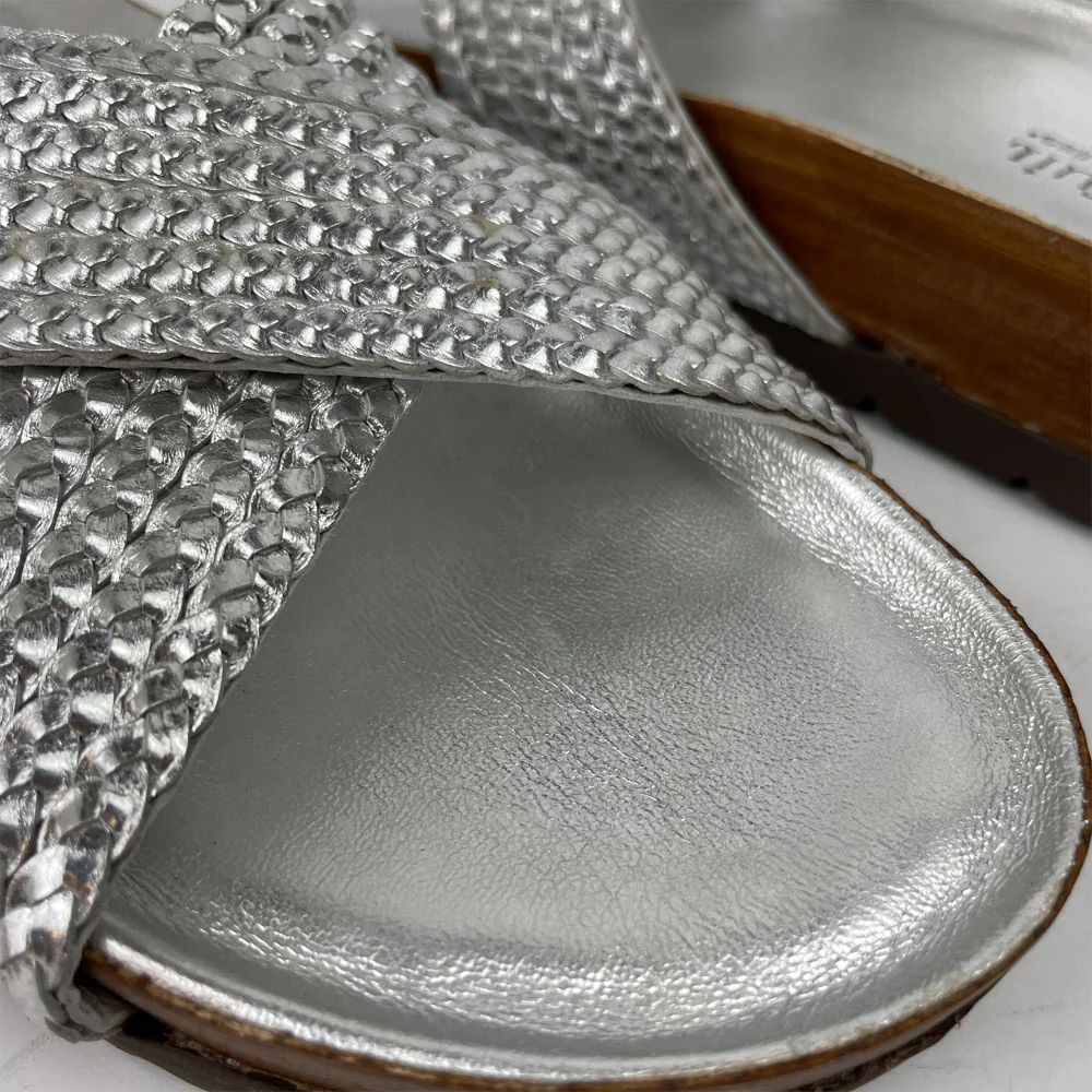 Laissez-vous séduire par le confort des sandales plates Ann Tuil modèle Avocat en cuir tressé métallisé argent pour cet été. Découvrez toute la collection de chaussures sur Ann Tuil.