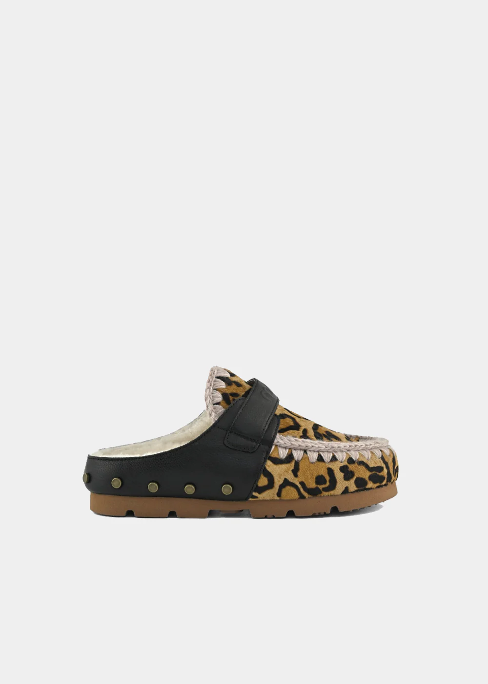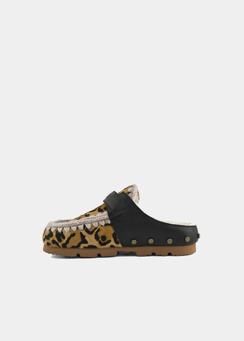 La mule plate Mou modèle Winter Bio Ponyskin léopard est confectionnée à la main avec soin, avec des coutures en laine crochetées main, signature de Mou, et une tige en cuir véritable. La semelle extérieure flexible est en EVA léger et caoutchouc pour plus de confort et de durabilité.