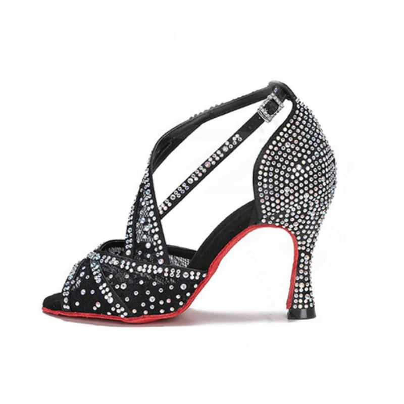 Illuminez vos pas avec les Chaussures de Danse « Noir Étincelant ». Leur design sophistiqué en noir orné de strass et leurs semelles rouges apportent une touche de glamour et d’élégance, parfaites pour faire sensation sur la piste.