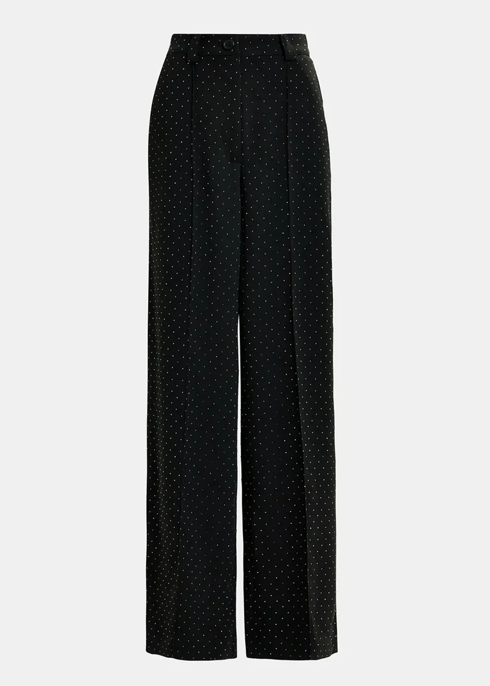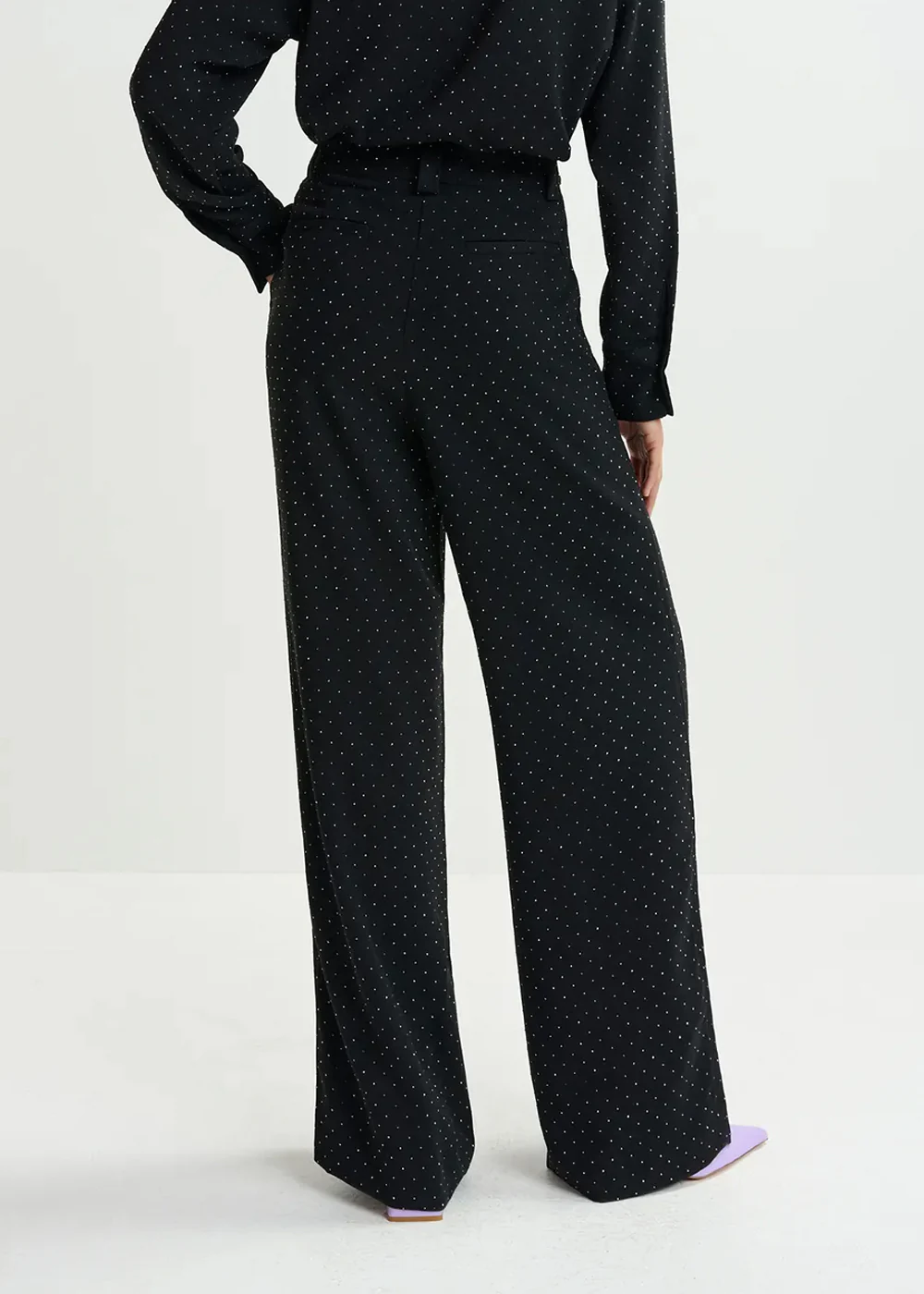 Pantalon réalisé en polyester recyclé orné de strass. Le modèle à jambes larges est doté de deux poches passepoilées à l’arrière, de poches italiennes à l’avant et d’une fermeture zip et bouton.