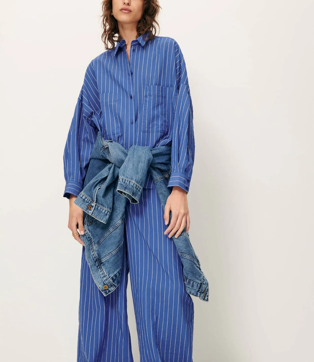 Pantalon ample à plis en popeline compacte effet crinkle, à rayures dobby tissé en Italie.