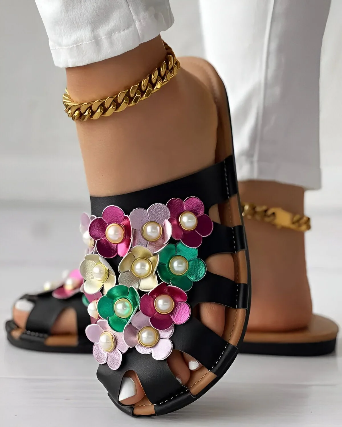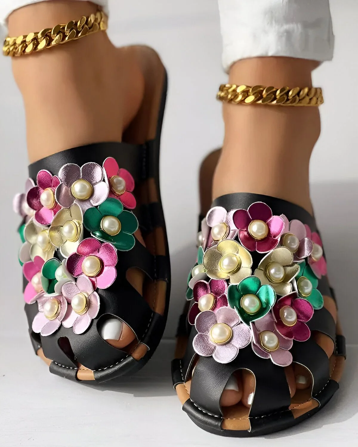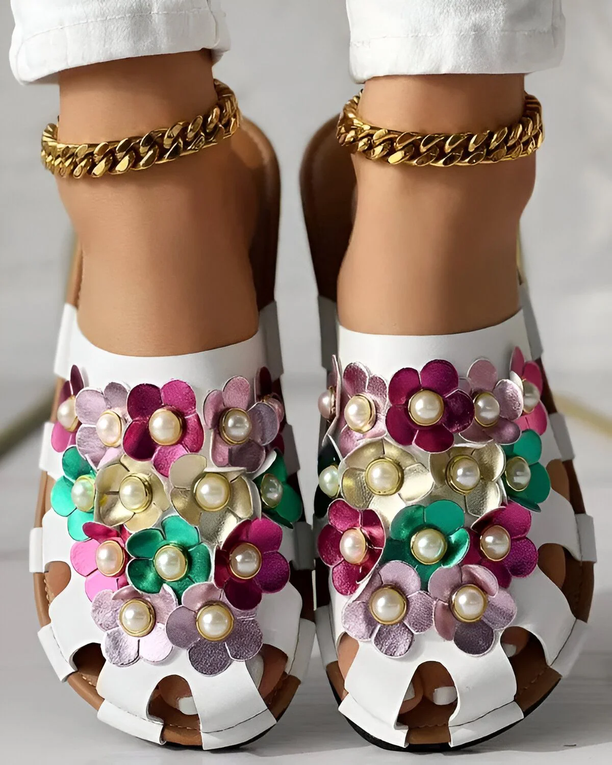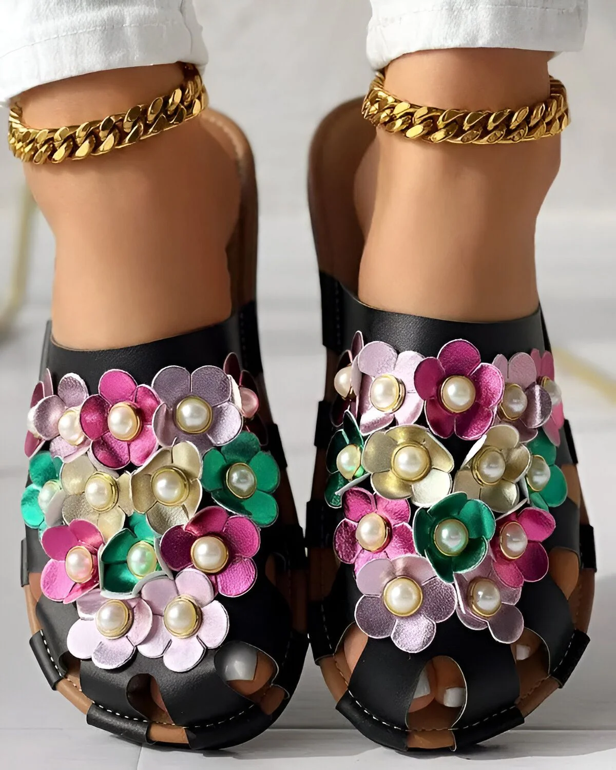 Ces pantoufles à motif floral ajoutent une touche sophistiquée à votre tenue grâce à leur design floral délicat et leurs perles ajourées qui captent la lumière avec grâce. Chaque détail est pensé pour mettre en valeur votre style personnel, offrant une esthétique à la fois subtile et raffinée.