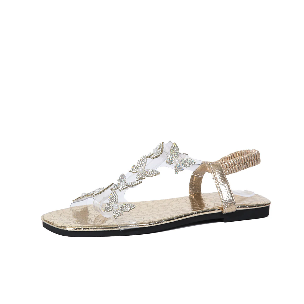 Ces sandales plates sont l’équilibre parfait entre confort et élégance. Les détails scintillants en forme de papillons attirent le regard, tandis que le bout carré moderne sublime la silhouette du pied. Idéales pour vos promenades estivales ou vos sorties entre amies.