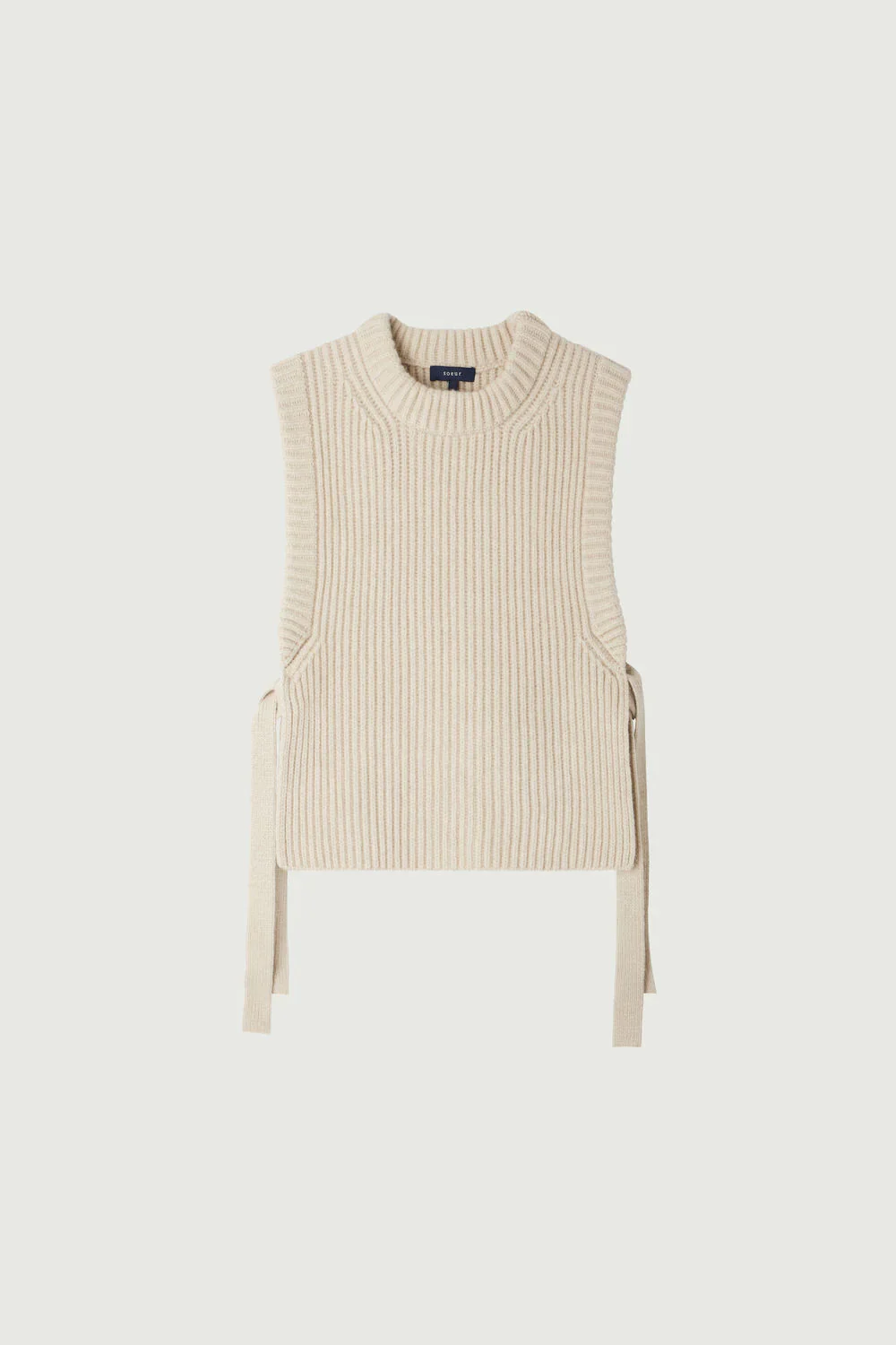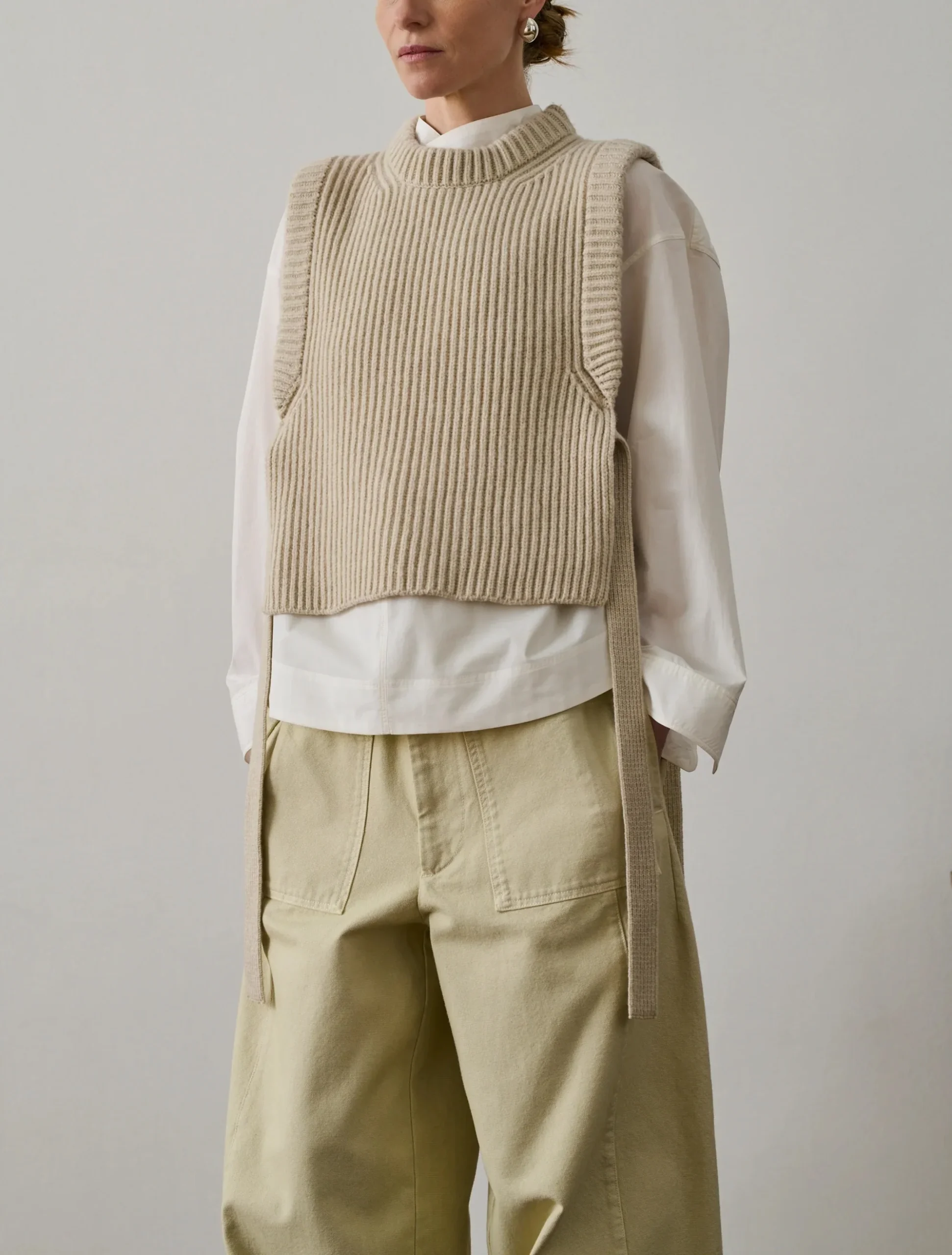 – Coupe droite– Sans manches– Col rond– Liens de serrage sur les côtés– Ouvert sur les côtés– Jeu de côtes sur le corps– Laine mérinos