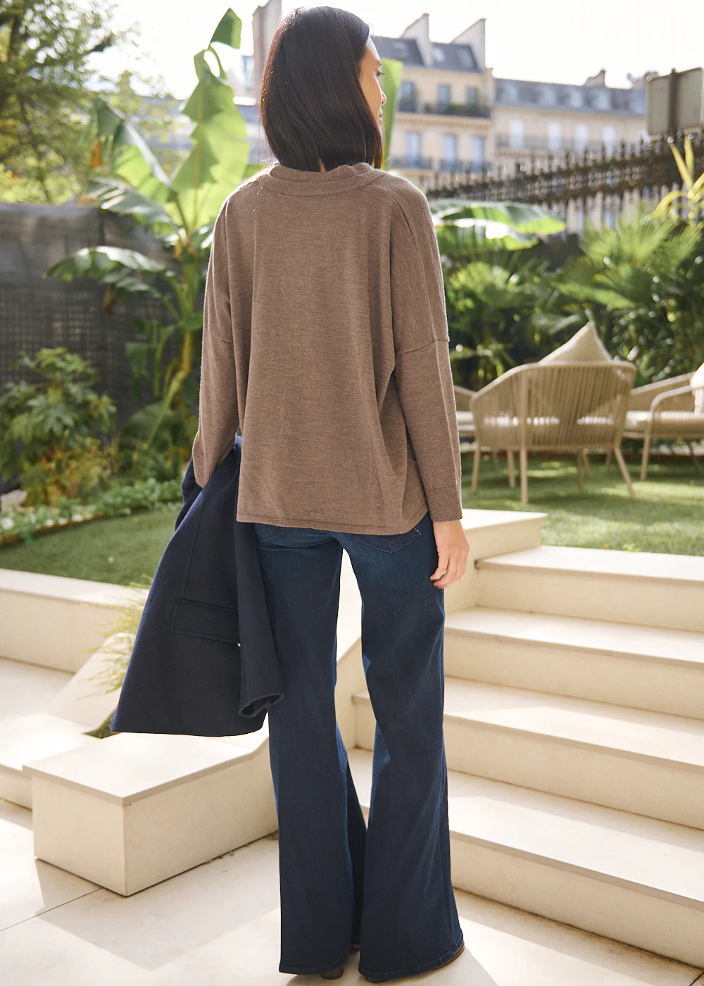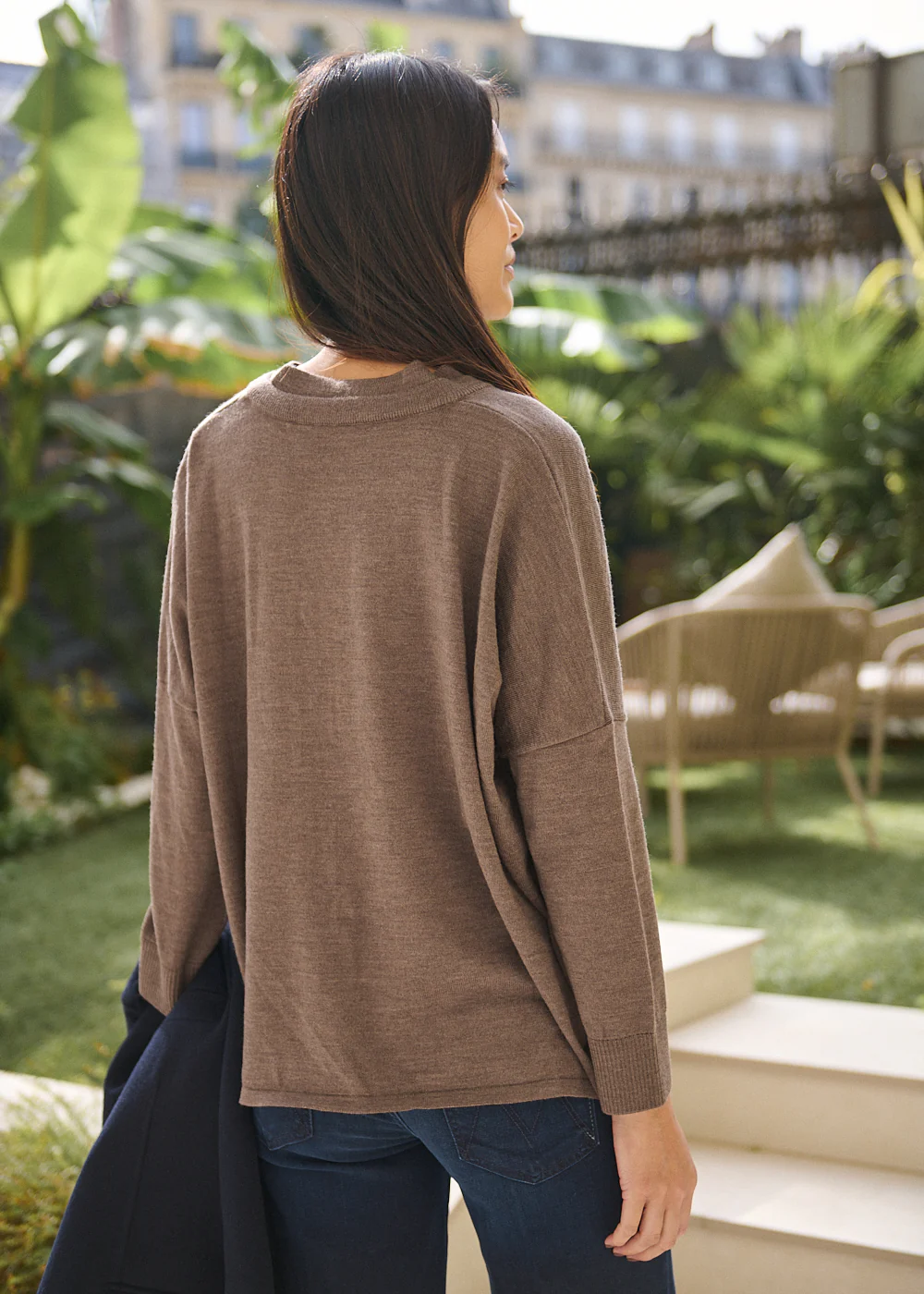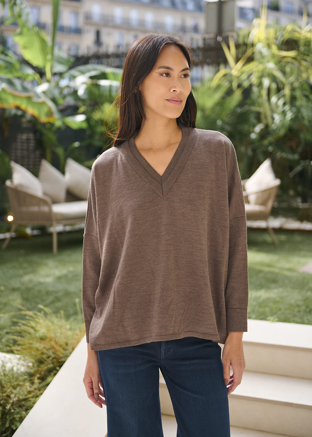 Le pull Hana San Erik en laine mérinos séduit par sa simplicité travaillée. Son col V met en valeur le port de tête, tandis que sa coupe droite, légèrement plus longue à l’arrière, structure la silhouette avec naturel. La teinte taupe s’accorde facilement à votre vestiaire, pour une allure douce et contemporaine au quotidien.