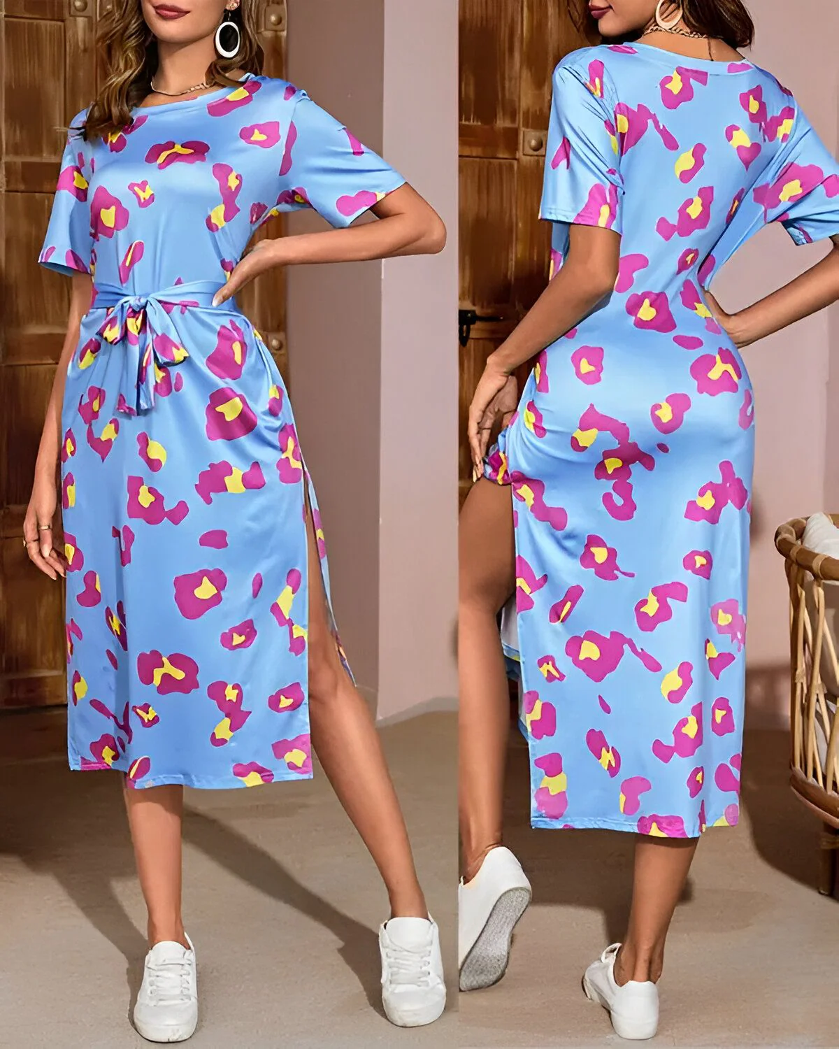 Cette robe décontractée fendue à imprimé léopard rose offre une polyvalence sans compromis. Son style décontracté s’accorde harmonieusement avec diverses occasions, que ce soit pour une journée au bureau, une virée shopping entre amis ou une soirée décontractée en ville.