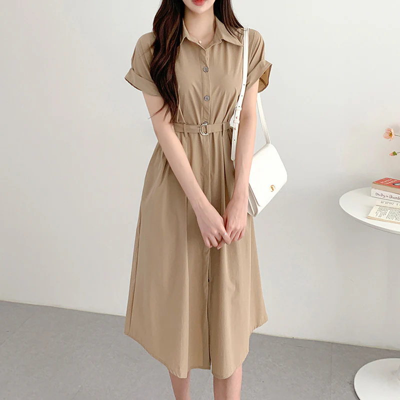 Adoptez un style raffiné et intemporel avec la robe « Élise », parfaite pour l’été. Son col chemise sophistiqué, sa taille ajustée avec une ceinture élégante et ses manches courtes légères en font une pièce idéale pour une allure chic et décontractée. Son tissu fluide assure un confort optimal, parfait pour une journée en ville ou une sortie estivale.