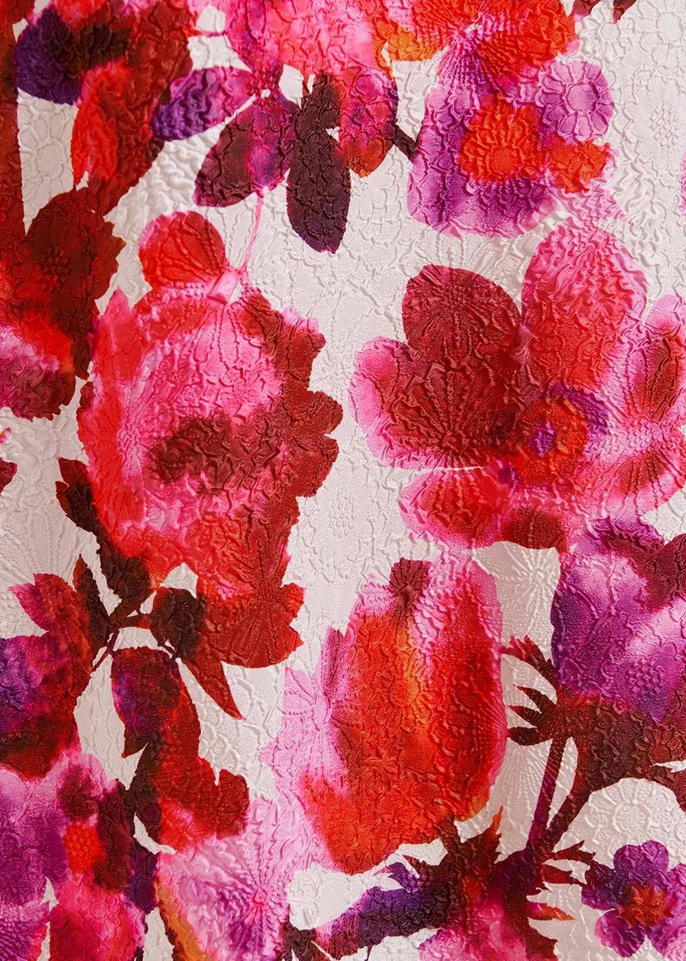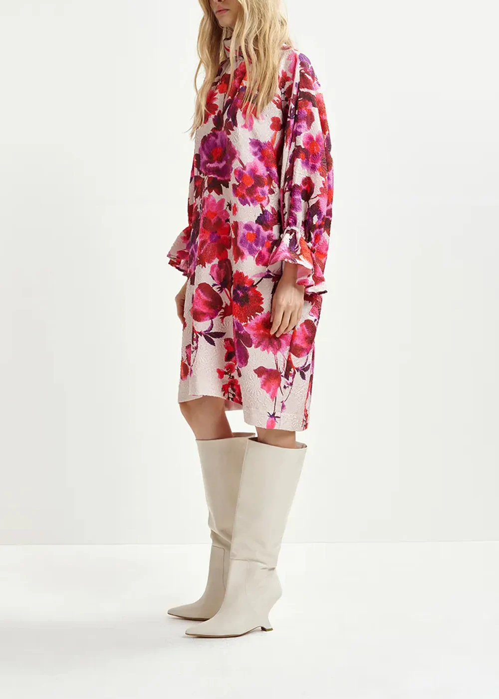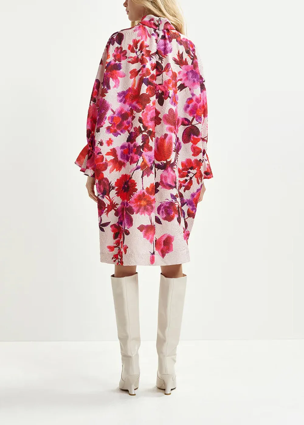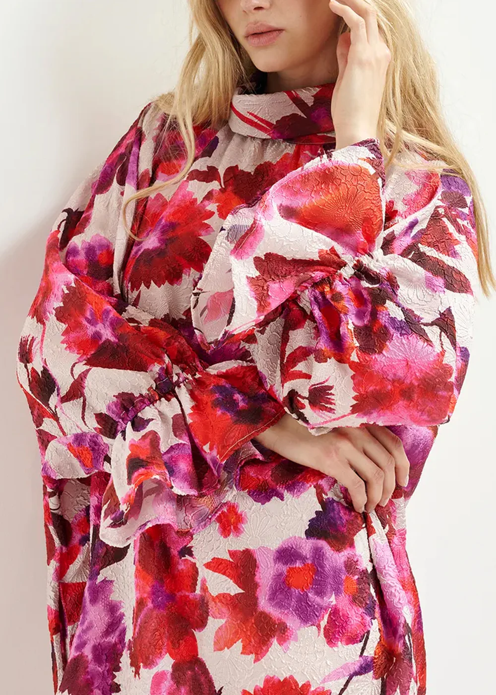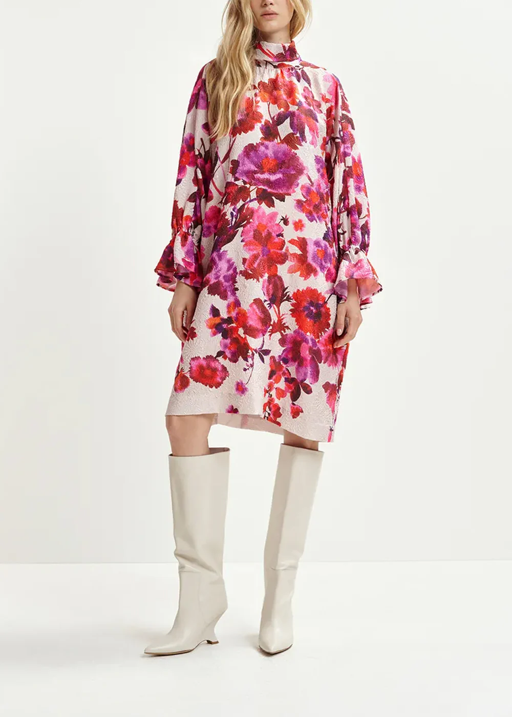Arborant un imprimé fleuri, cette robe courte est agrémentée de manches bouffantes et d’un élégant col montant replié. Sa coupe décontractée est renforcée davantage par les petits plis au niveau de l’encolure et les poignets élastiques.