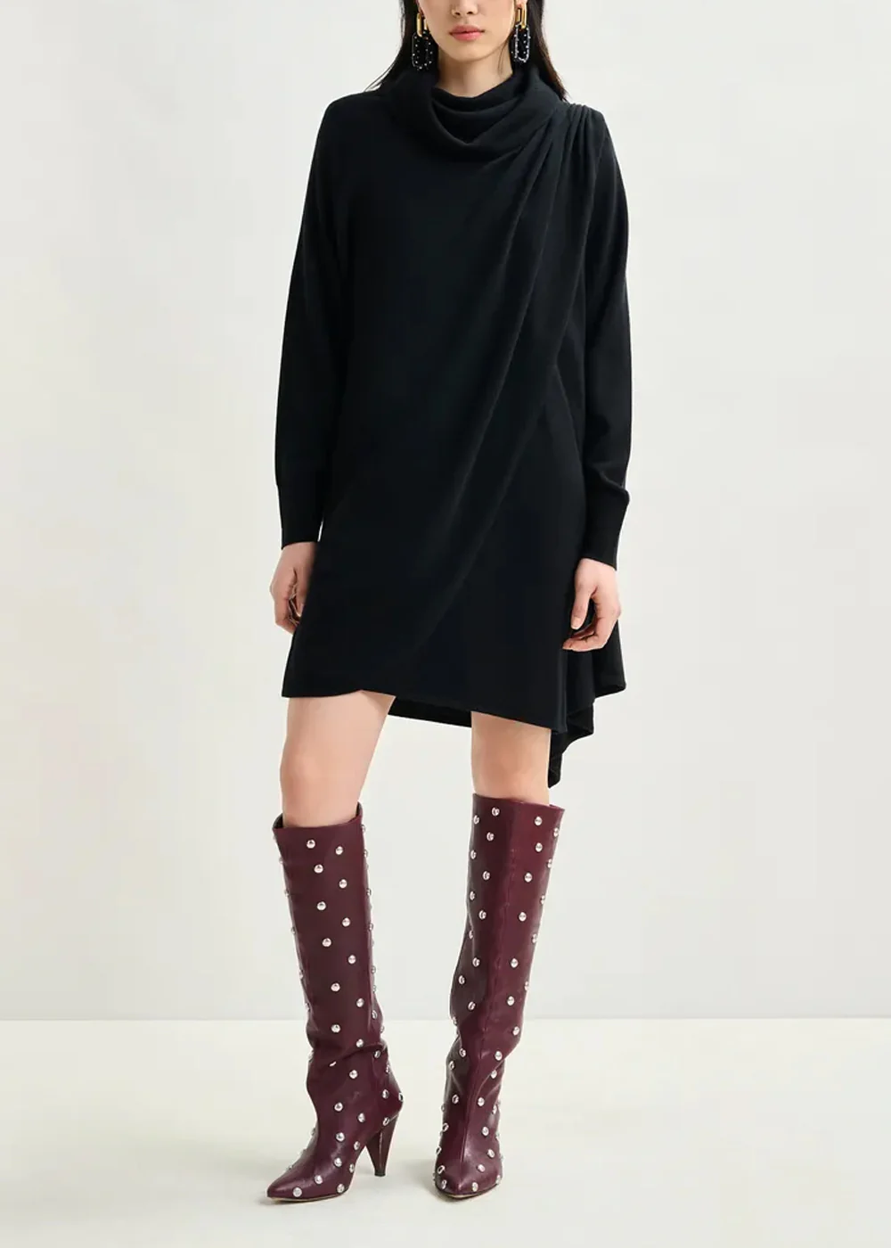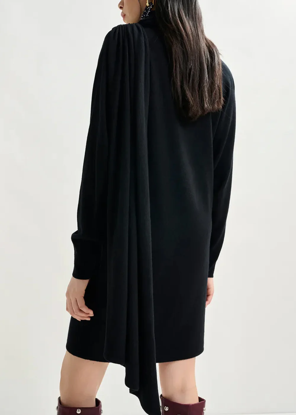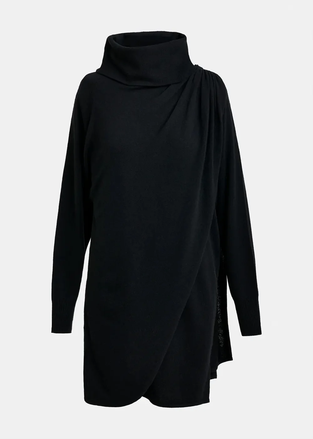 Robe en maille asymétrique, réalisée à partir d’un tissu extensible en laine mélangée qui se drape joliment. Elle présente une coupe décontractée, accentuée par des épaulettes amovibles structurées. Le col roulé et les détails de ruches au niveau des épaules et des coutures latérales de la taille créent une silhouette sculpturale, tandis que le drapé théâtral ajoute fluidité et mouvement.