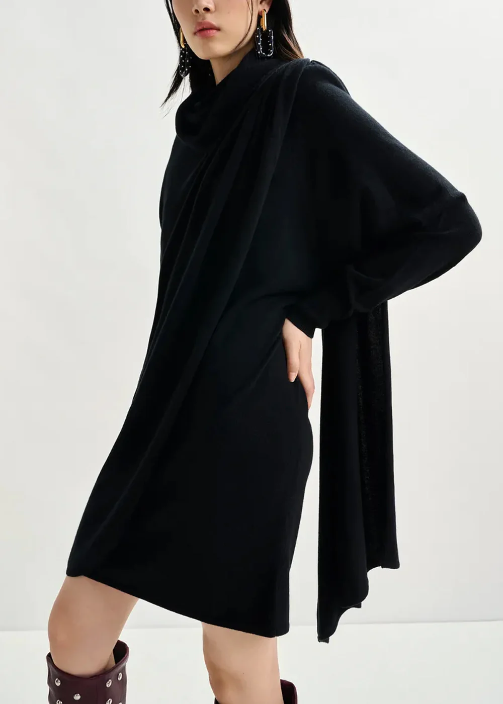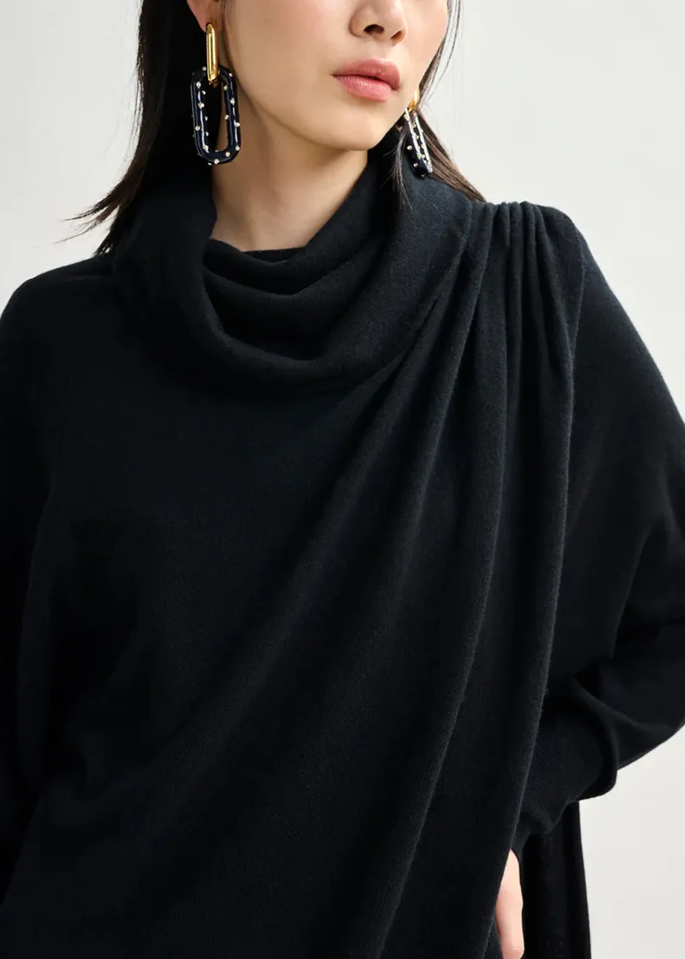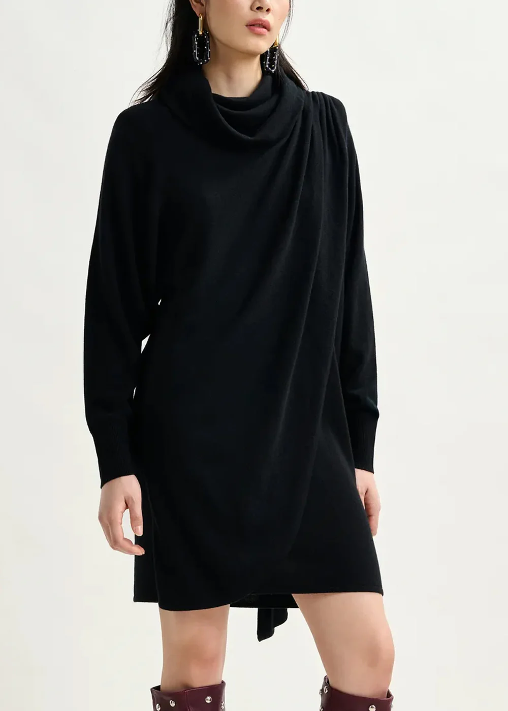 Robe en maille asymétrique, réalisée à partir d’un tissu extensible en laine mélangée qui se drape joliment. Elle présente une coupe décontractée, accentuée par des épaulettes amovibles structurées. Le col roulé et les détails de ruches au niveau des épaules et des coutures latérales de la taille créent une silhouette sculpturale, tandis que le drapé théâtral ajoute fluidité et mouvement.