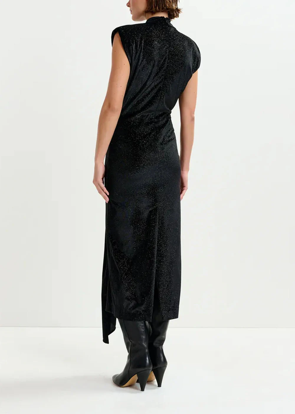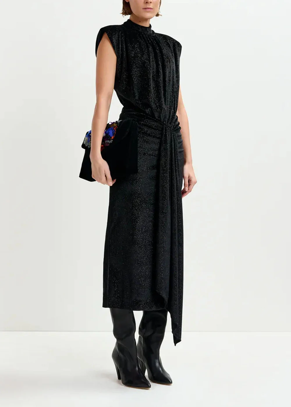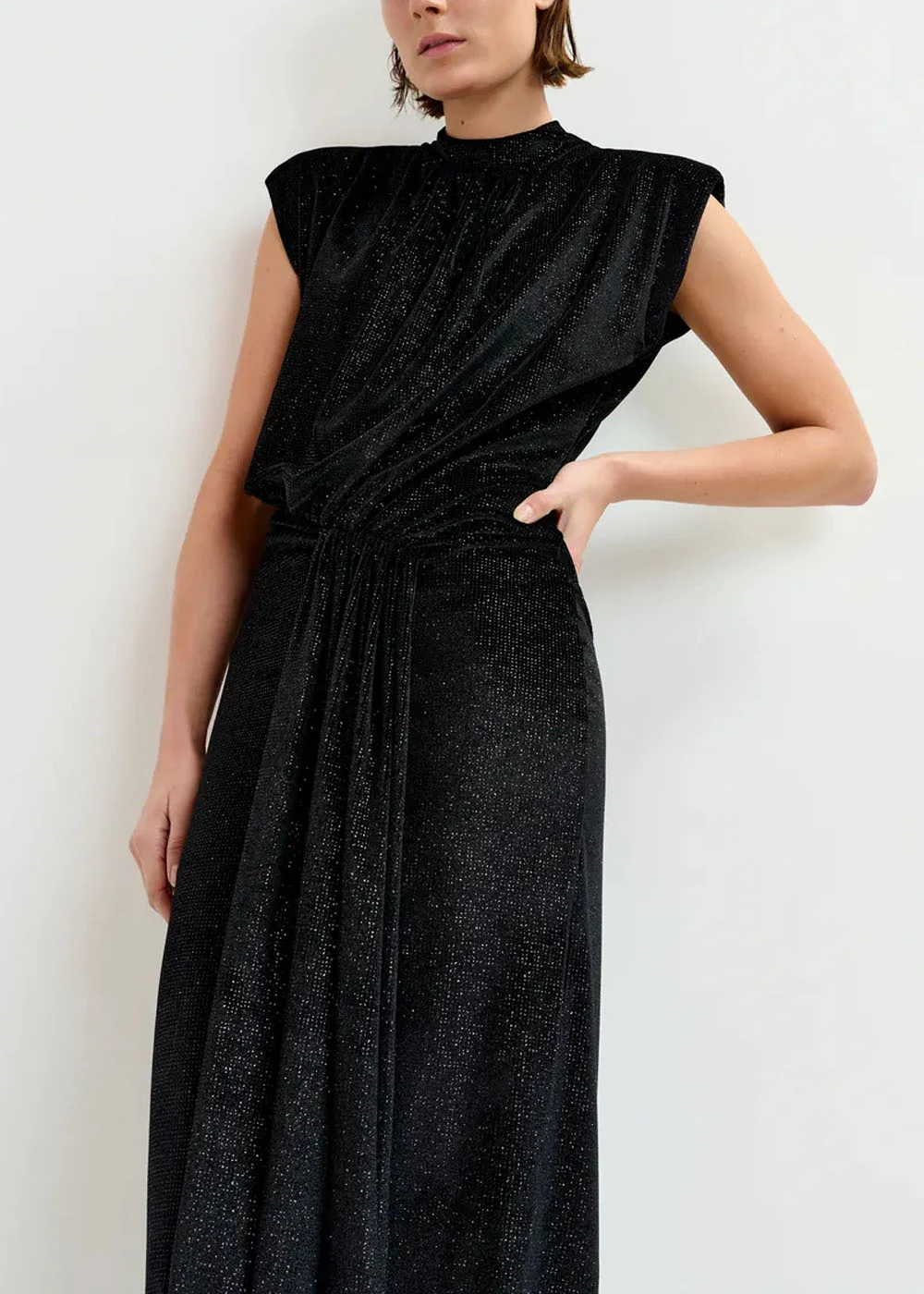 Préparez-vous à briller sur la piste de danse avec cette robe mi-longue, confectionnée dans un jersey extensible confortable et ornée de pois noirs créant un effet de paillettes. Elle présente une coupe près du corps au niveau de la taille et se prolonge en une jupe style portefeuille à doubles plis, dotée d’une fente généreuse. Les épaules légèrement rembourrées et le col montant flatteur subliment sa silhouette.