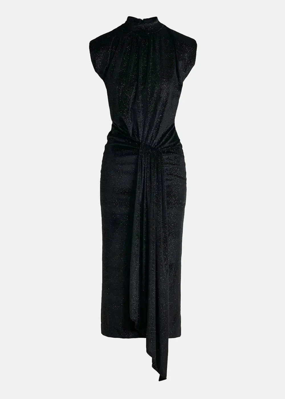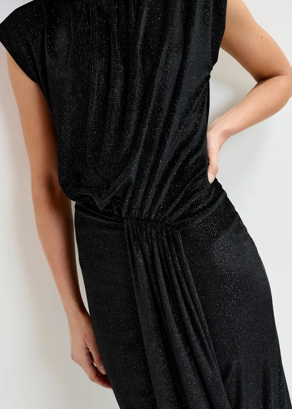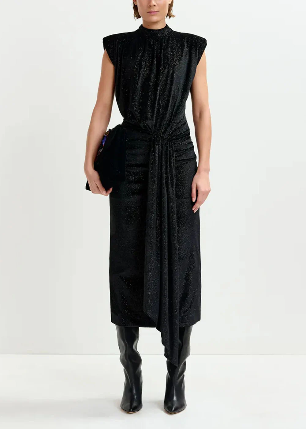 Préparez-vous à briller sur la piste de danse avec cette robe mi-longue, confectionnée dans un jersey extensible confortable et ornée de pois noirs créant un effet de paillettes. Elle présente une coupe près du corps au niveau de la taille et se prolonge en une jupe style portefeuille à doubles plis, dotée d’une fente généreuse. Les épaules légèrement rembourrées et le col montant flatteur subliment sa silhouette.
