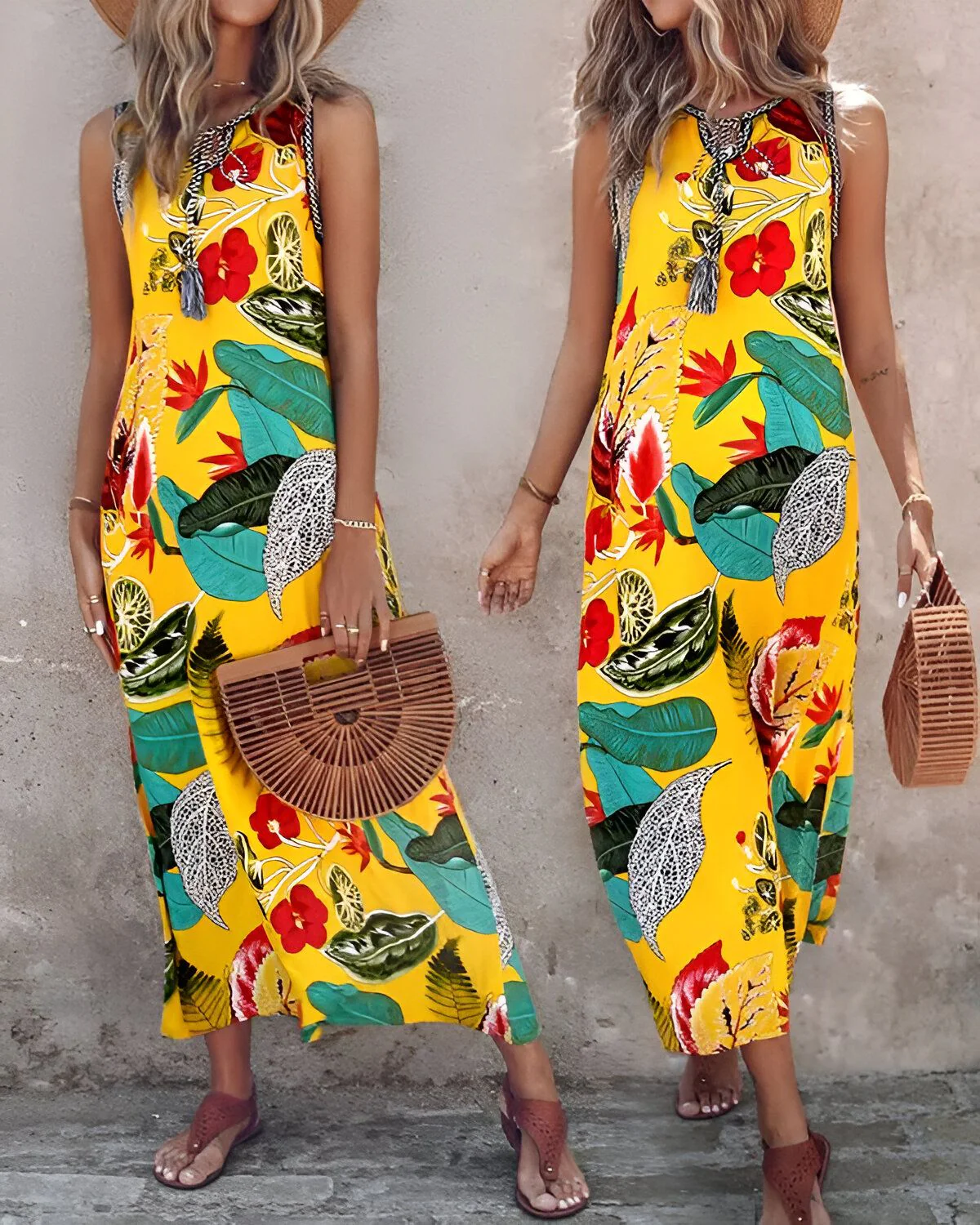 Cette robe longue évoque un charme vintage intemporel, idéale pour celles qui recherchent une silhouette élégante et féminine. Confectionnée en 100 % polyester, elle vous offre un confort inégalé tout au long de la journée. Sa coupe droite et son style sans manches lui confèrent une allure à la fois décontractée et raffinée, qui s’adapte parfaitement à une variété d’occasions.