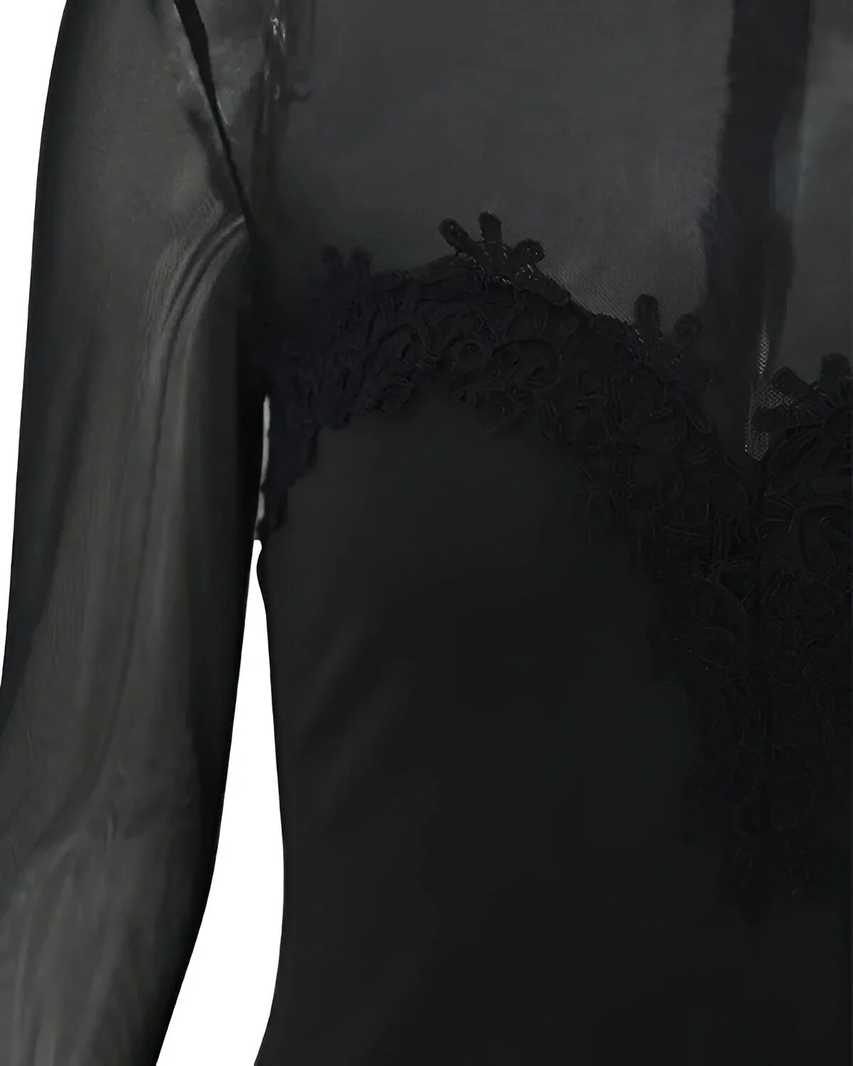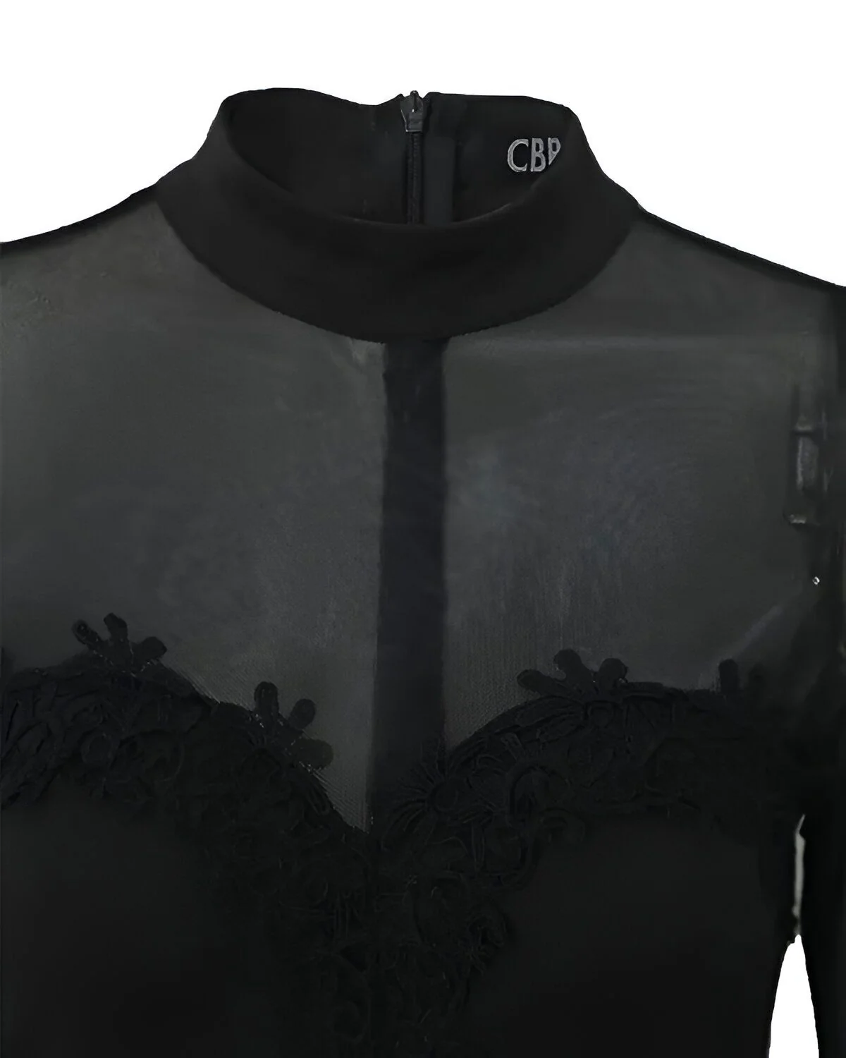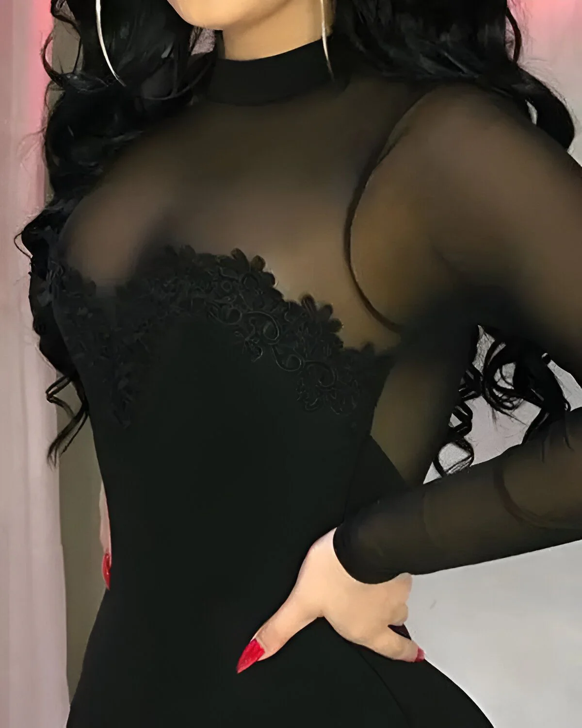 Robe moulante à broderie florale en maille transparente – Véritable ode à la féminité, cette robe se pare d’une broderie florale délicate qui sublime sa maille transparente. Sa coupe moulante, épousant les formes avec sensualité, se conjugue à un col montant et des manches longues pour une allure à la fois élégante et mystérieuse. Sa longueur mini insuffle une touche de modernité irrésistible à l’ensemble.