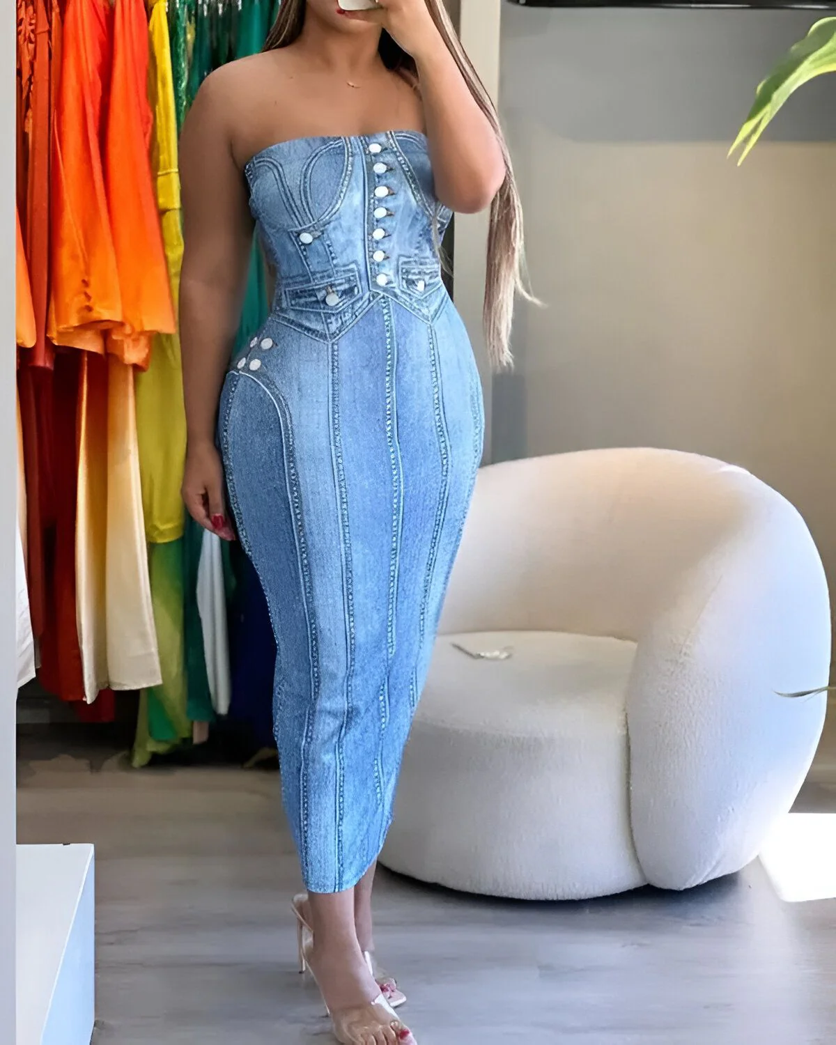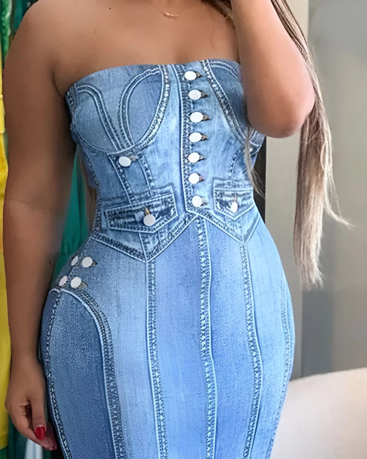 La robe moulante bandeau à imprimer effet denim incarne l’élégance contemporaine et la polyvalence. Fabriquée avec un souci du détail et un savoir-faire impeccable, cette pièce captivante offre une fusion parfaite entre style chic et confort sans compromis. Confectionnée en 100 % polyester, elle épouse harmonieusement les courbes, accentuant gracieusement la silhouette avec son design moulant et sa longueur mi-mollet. Dotée d’un décolleté bandeau et d’une coupe sans manches, elle incarne la quintessence du raffinement moderne.