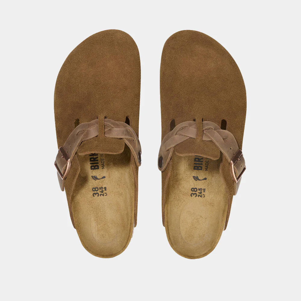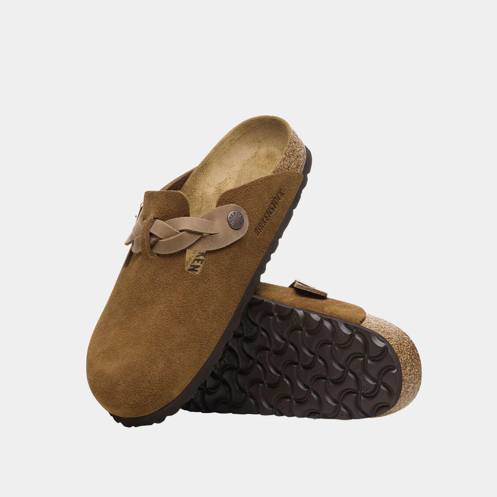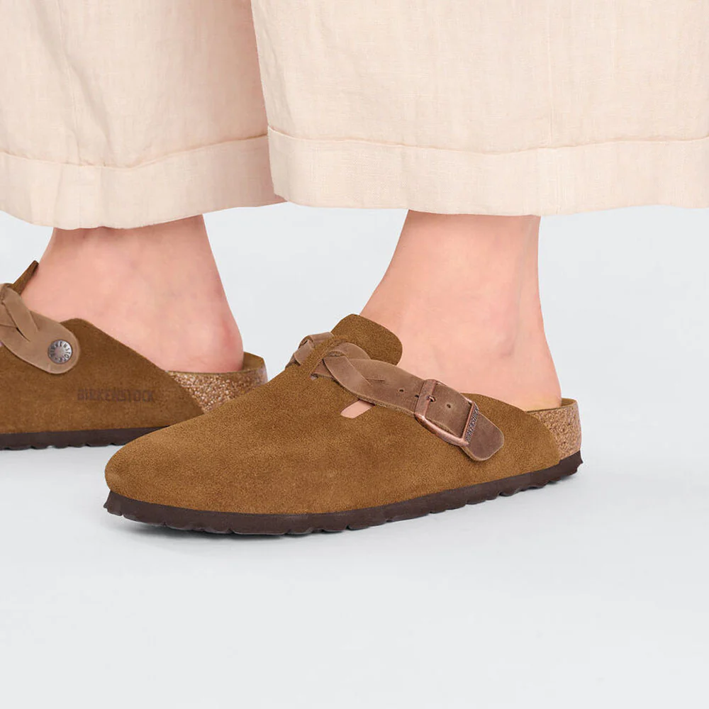 Grand classique BIRKENSTOCK, le sabot Boston se porte en toute saison. Avec son design raffiné et sa largeur réglable individuellement, le sabot Boston figure parmi les produits cultes de la marque. Cette chaussure arbore ici un détail particulier : des brides tressées, qui se marient parfaitement à un style bohème actuel. Sa tige a été confectionnée dans un cuir velours particulièrement doux qui drape le pied comme une seconde peau.