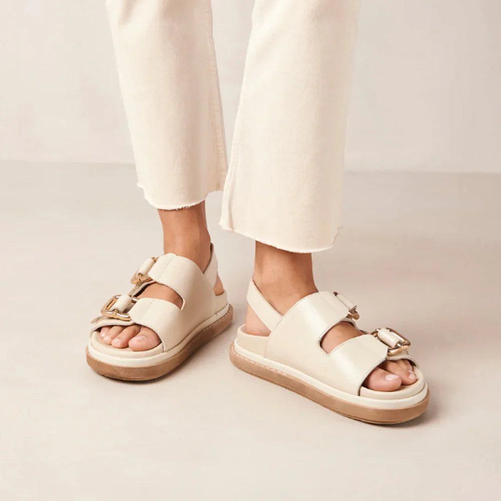 Les sandales Alohas Harper en cuir crème vont faire décoller votre style cet été. Les sandales Harper sont dotées d’une semelle intérieure moulée et d’une semelle extérieure compensée en caoutchouc. Grâce à leur ouverture à l’arrière, elles sont confortables à porter. Les boucles dorées sur les larges brides offrent une finition raffinée.