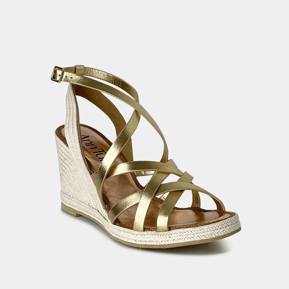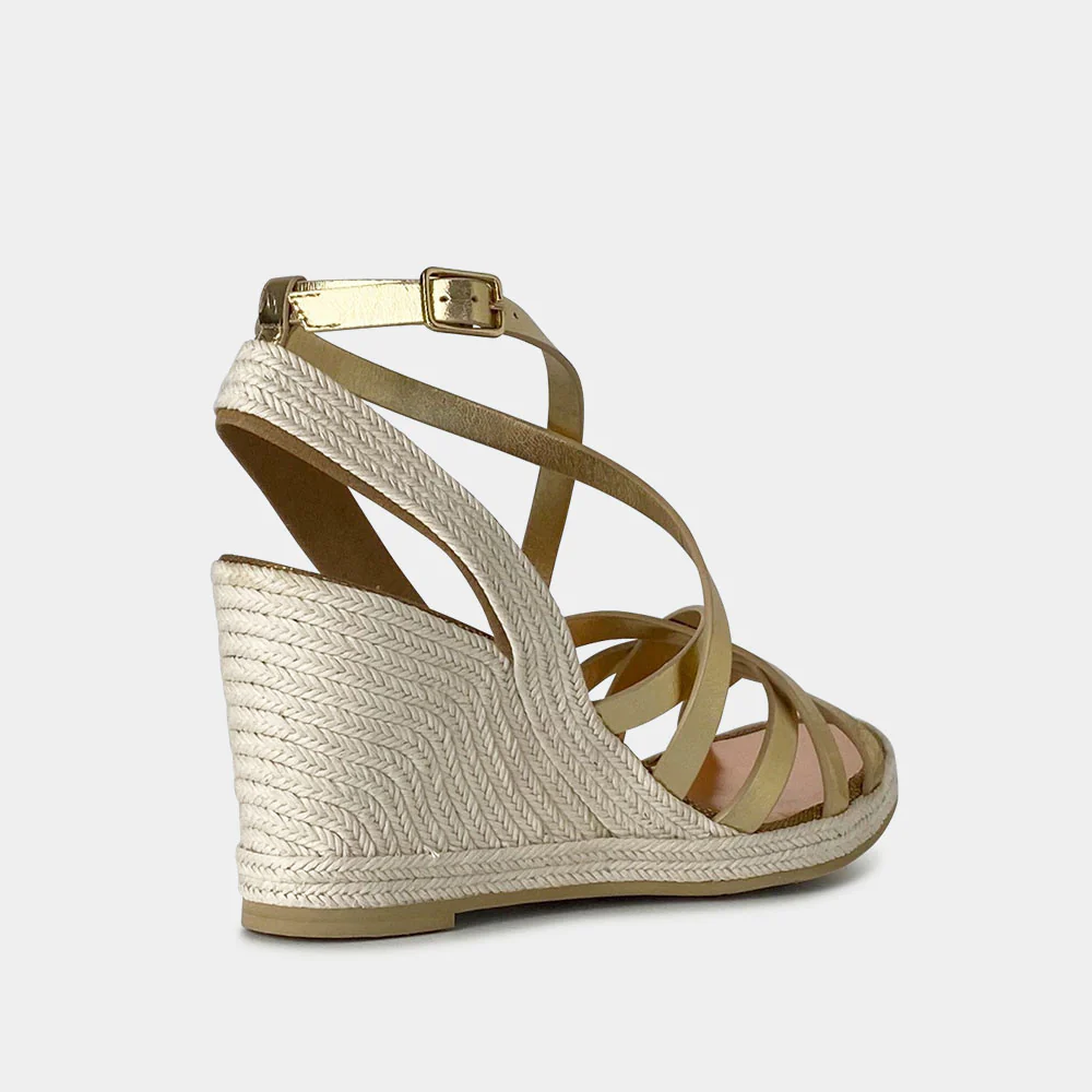 Les sandales compensées sont un essentiel pour la période estivale. Notre modèle Caroline en cuir métallisé doré est élégante et très féminine. Elle sera parfaite pour allonger votre silhouette tout en restant confortable tout au long de la journée.