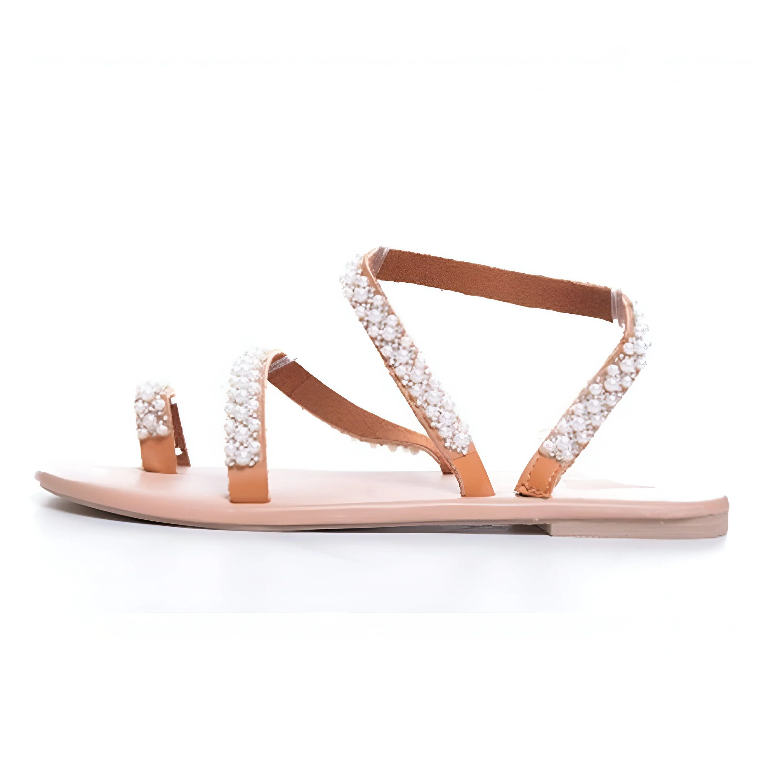Leurs courbes s’adaptent délicatement à la forme de votre pied, offrant un confort absolu même après des heures de marche. La subtile brillance des perles ajoute une note de sophistication discrète, parfaite pour une soirée estivale ou une simple promenade en ville. Ces sandales plates s’intègrent parfaitement dans votre style, que vous préfériez un look bohème, décontracté ou chic.