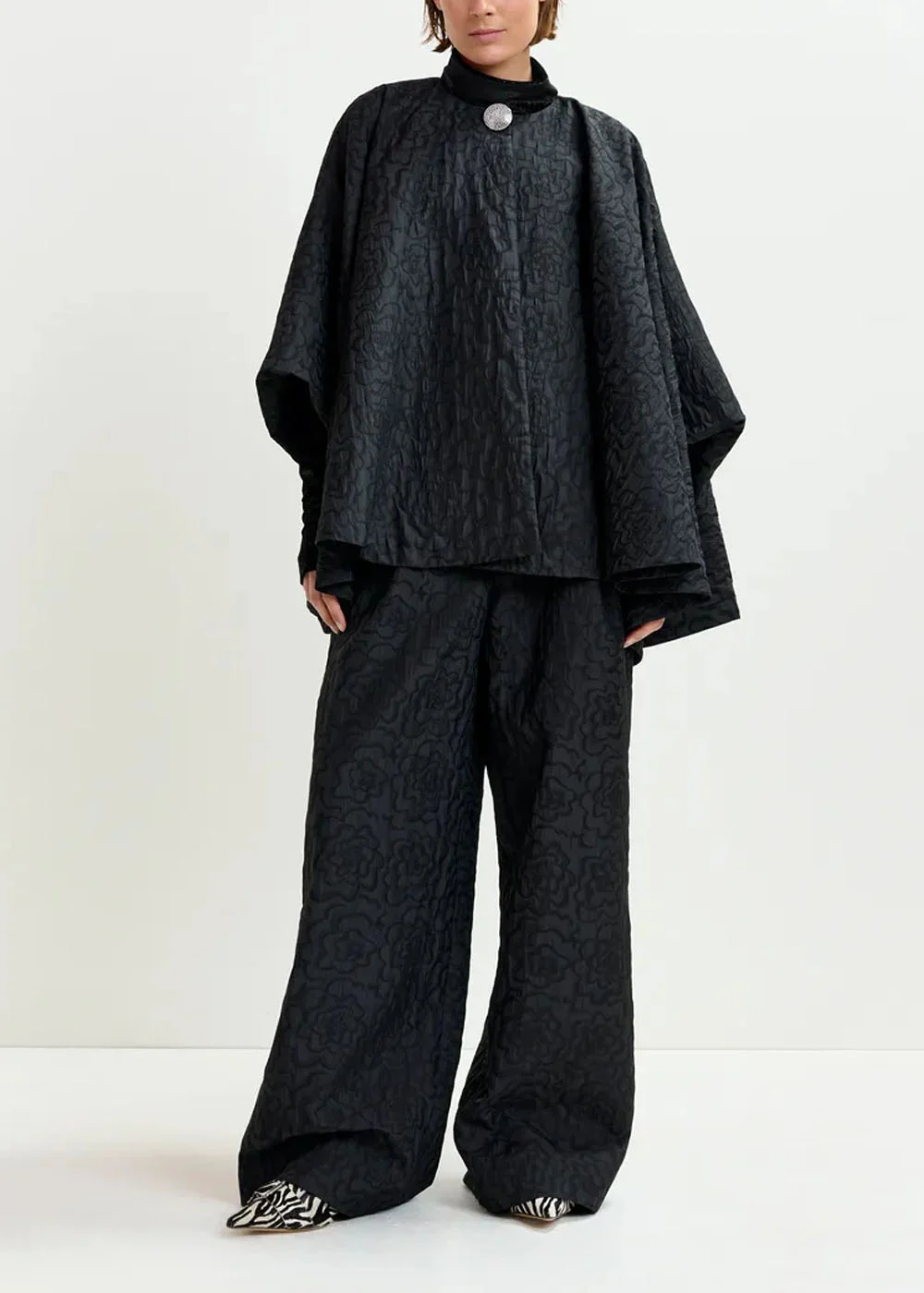 Confectionnée à partir d’un jacquard en polyester recyclé mélangé, cette veste style cape se caractérise par son volume sculptural et son drapé élégant. Elle présente une coupe large oversize avec un ourlet évasé, une emmanchure basse et des manches type T-shirt. L’encolure est agrémentée d’un bouton en strass unique, ajoutant une dose d’éclat à vos tenues. La veste est entièrement doublée pour faciliter la superposition.