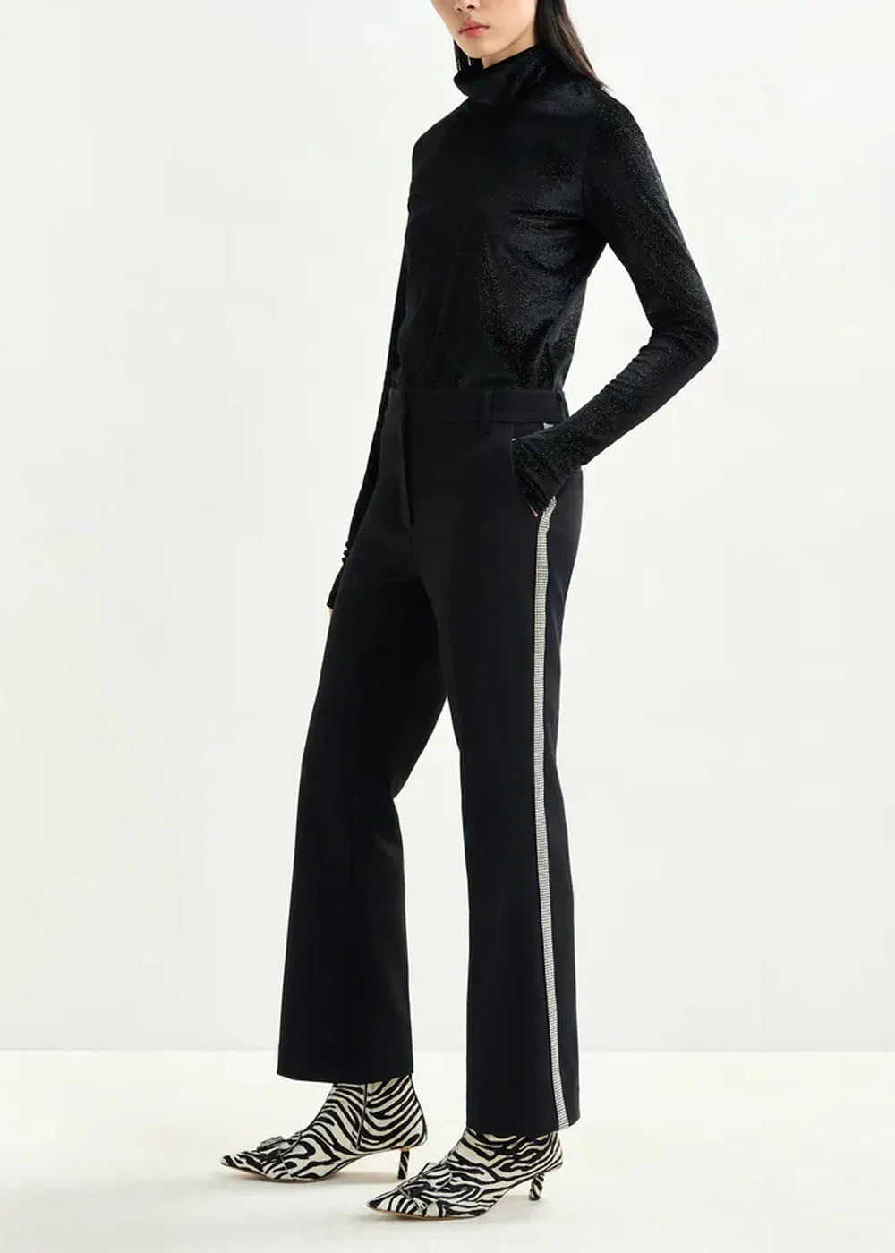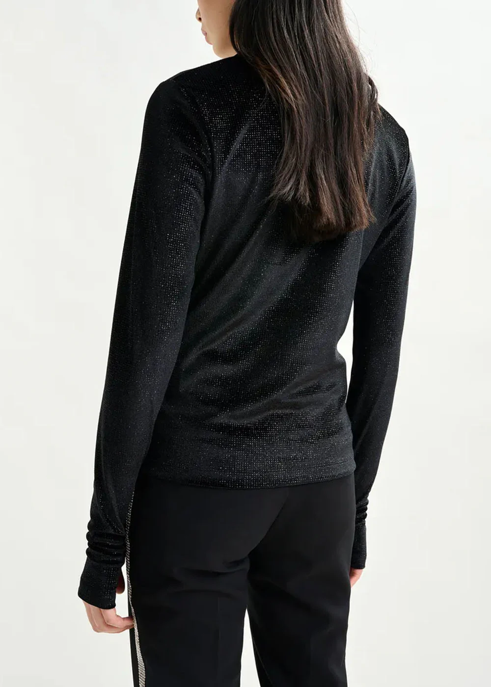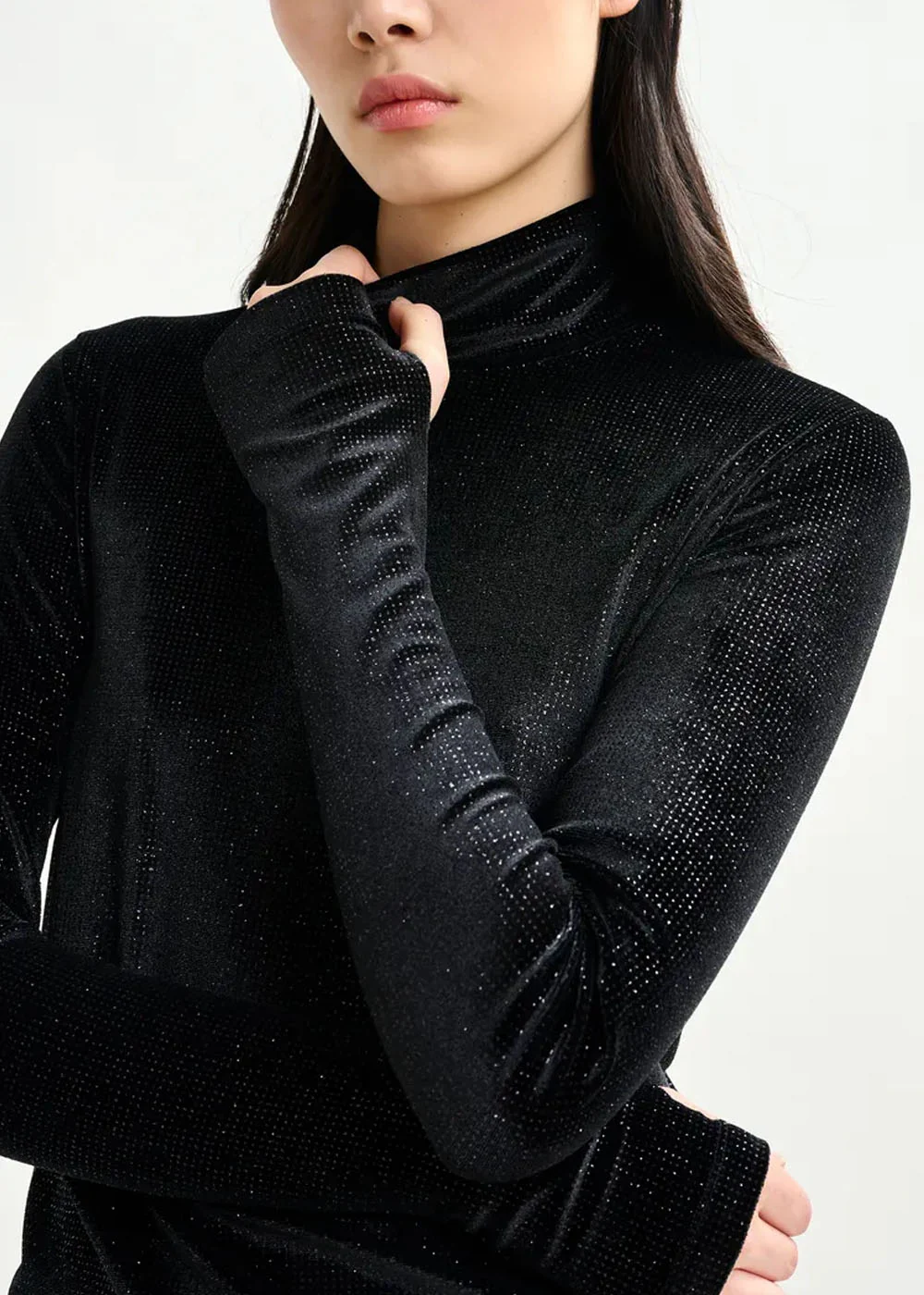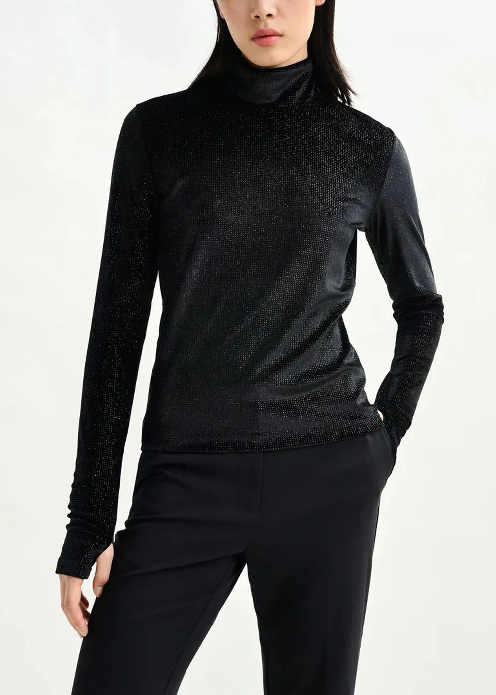 Préparez-vous à briller sur la piste de danse avec ce haut à col roulé, confectionné en jersey extensible confortable et orné de pois noirs créant un effet de paillettes. Sa coupe ajustée s’associe aussi bien à des pièces de tailleur qu’à des jupes.