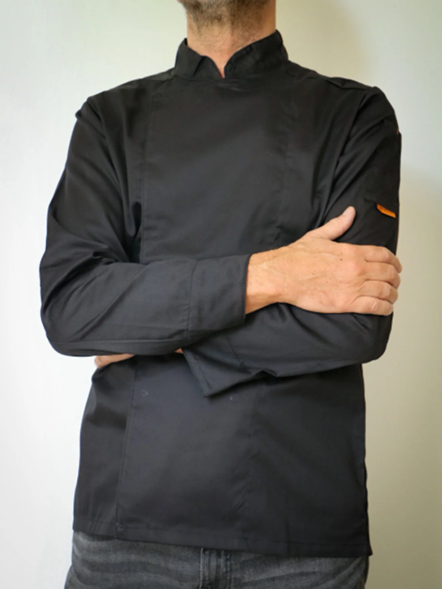 Veste pratique, sa coupe est slimfit, le boutonnage pression sous rabat sur le devant, les poignets français et les finitions surlignées complètent son style. Fonctionnelle, cette veste est équipée d’une poche stylo et d’une poche pour le stockage sécurisé. Elle dispose également d’une languette à l’arrière du col pour maintenir en place un tablier.