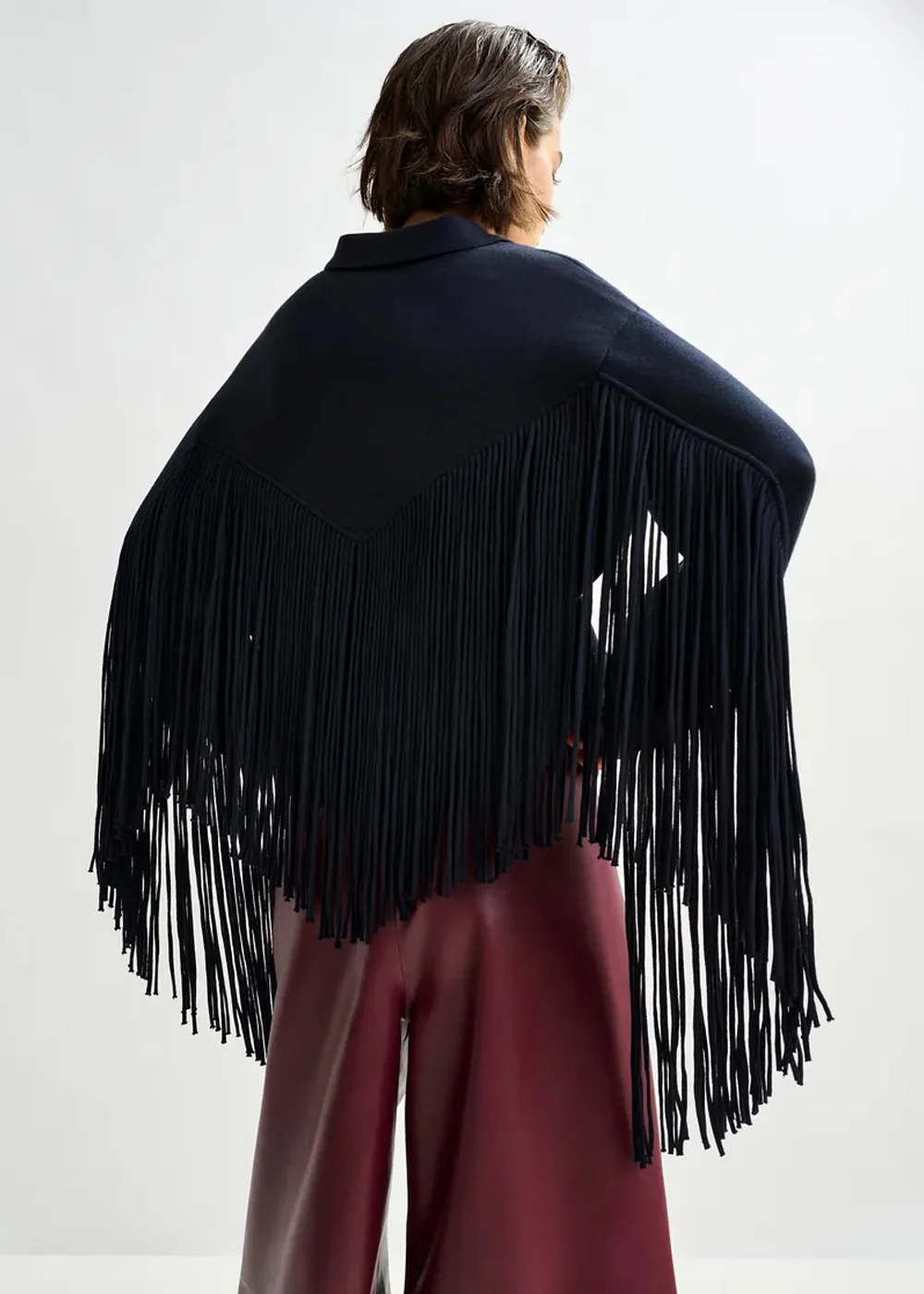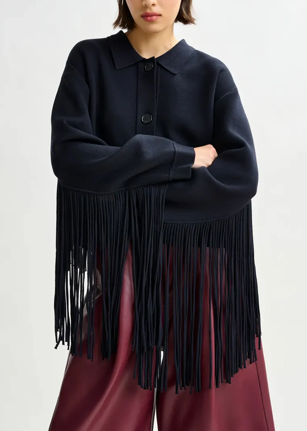Veste en maille fine, dotée d’une emmanchure basse qui accentue davantage sa coupe décontractée. Le modèle court est agrémenté de deux poches plaquées et d’une fermeture à boutons ton sur ton. Les détails de franges à l’arrière ajoutent une sensation de mouvement et de fluidité, créant un effet joyeux à chaque mouvement.