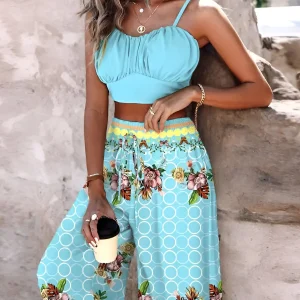 Ensemble caraco froncé et pantalon large froncé à imprimé plantes