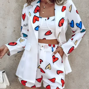Ensemble caraco et short à imprimé lettres et cœurs avec manteau blazer