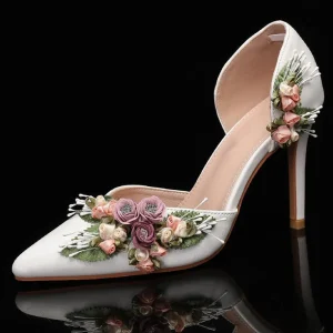 Escarpins Mary Janes en satin à fleurs et feuilles pour femmes, chaussures de mariée élégantes à bout pointu