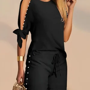 Ensemble haut à manches fendues et short à cordon de serrage Pearls Decor