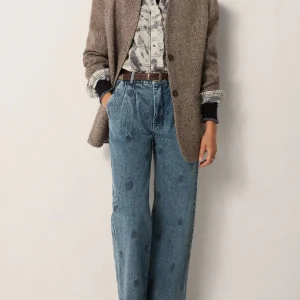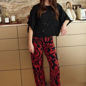 Pantalon skinny en maille transparente avec patch brodé en dentelle