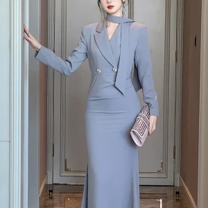 Robe longue élégante à la mode pour femmes, écharpe professionnelle OL, double boutonnage