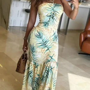 Robe longue nouée à imprimé feuilles et boutons découpés sur le devant