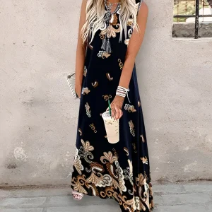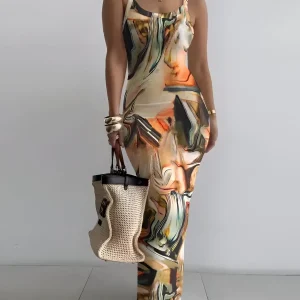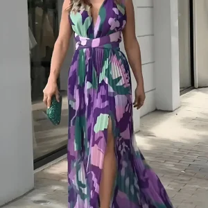 Robe longue froncée fendue et nouée sur l’ensemble imprimé
