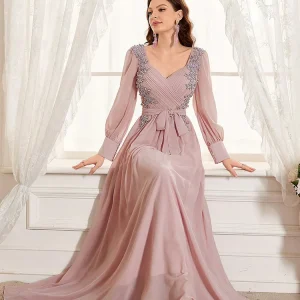 TOLEEN Robe à Manches Longues Soirée Bal Maxi de Luxe Élégant Col En V Froncé Fendu