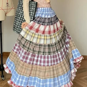 Zoki Bohême Douce Jupes Longues Femmes Lâche Taille Haute Plaid Patchwork Jupe Décontractée Vintage