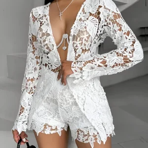 Haut à bretelles fines et encolure en V en dentelle guipure