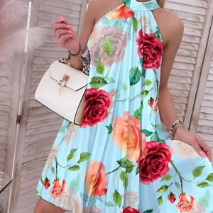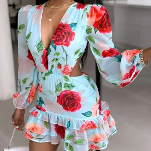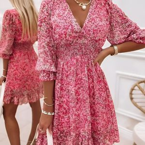 Robe rose froncée à petites fleurs et manches lanterne à volants