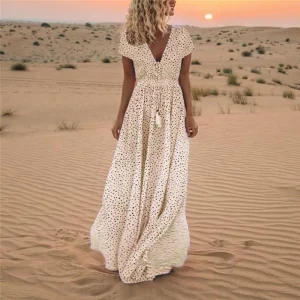 Robe longue à pois pour femme, élégante, col en V, style bohème, printemps, imprimé, à franges