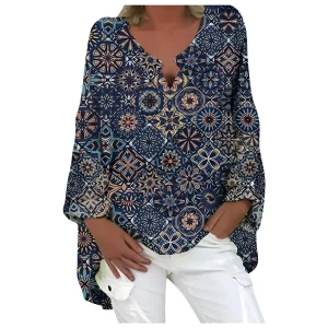 Clémence – T-shirt à Manches Longues avec Fleurs Géométriques et Col U, Boutonné