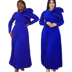 Robe de soirée élégante, couleur unie, col rond, manches longues, décoration 3D, plissée