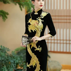 Robe chinoise améliorée, traditionnelle qipao broderie dragon national velours
