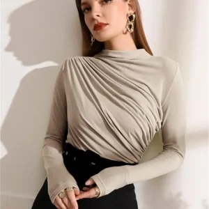T-shirt à manches longues pour femme, couleur unie, décontracté, mode, slim, plis, gaine