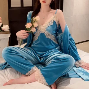 3 pièces Pyjamas ensemble vêtements Automne Hiver Velours de Nuit Sexy dentelle garniture Kimono Peignoir